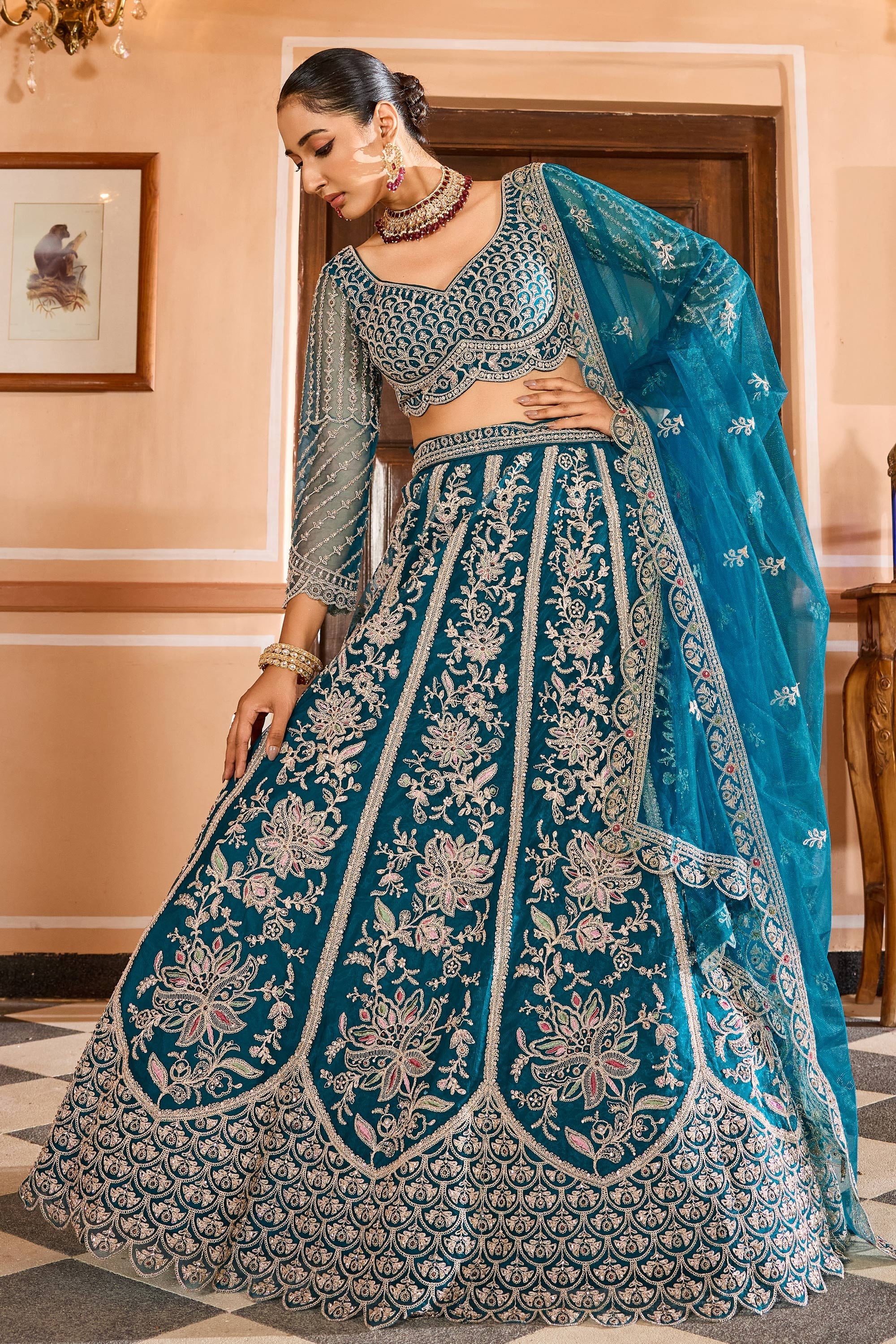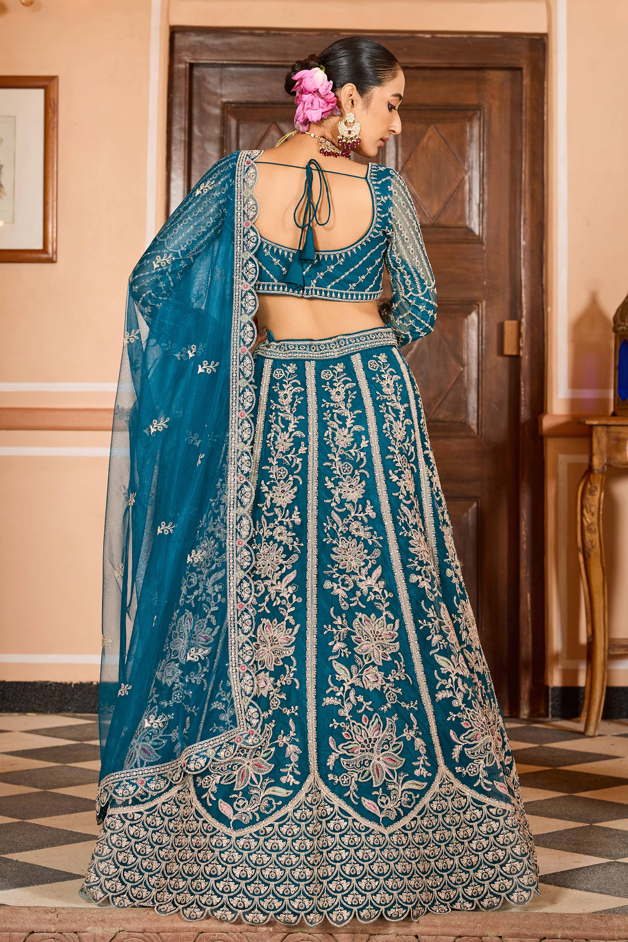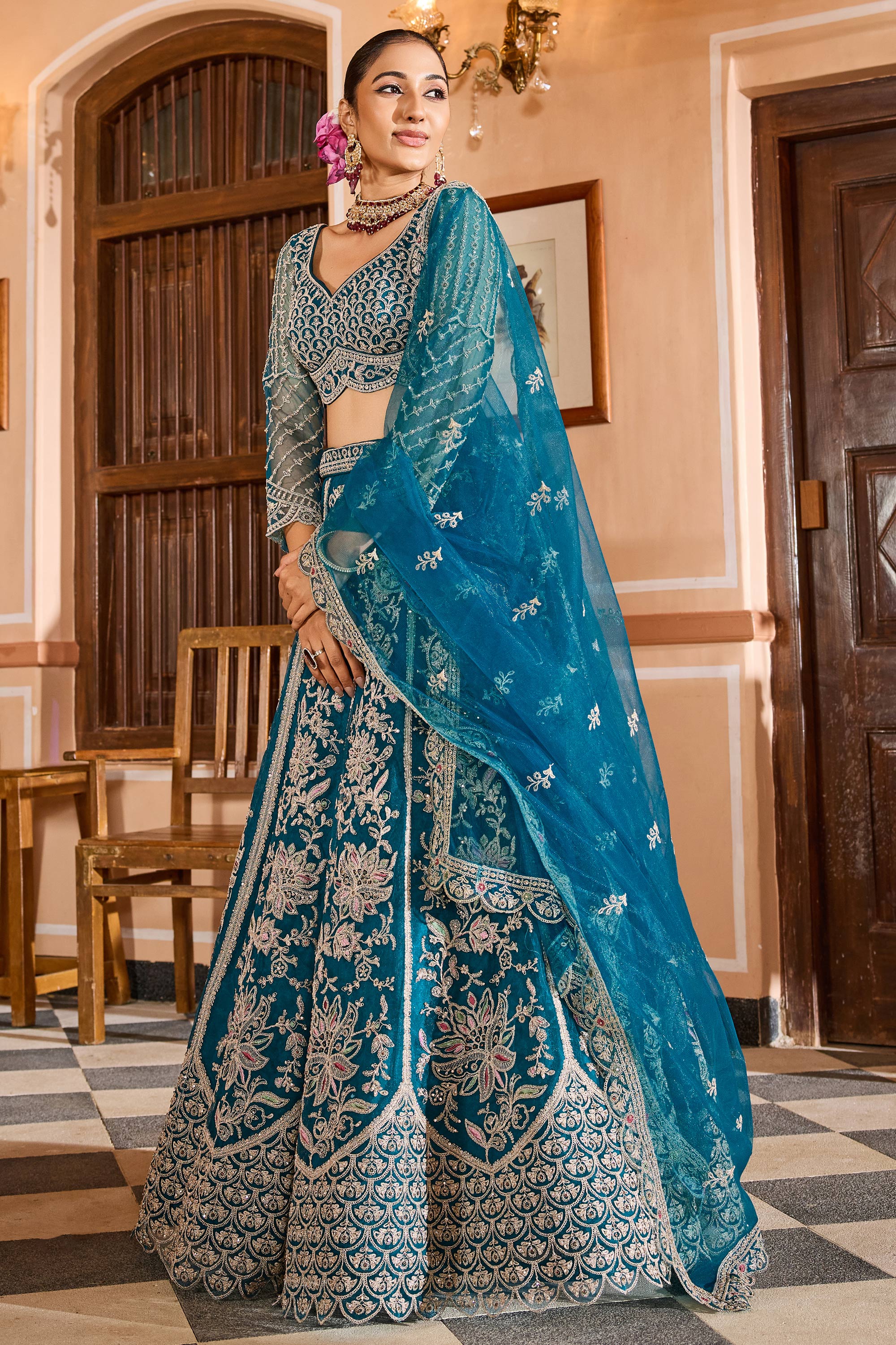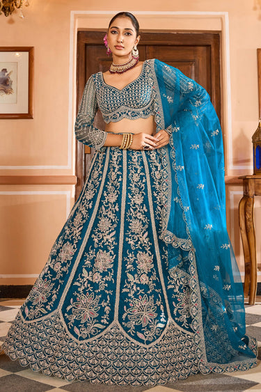Teal Net Fabric Wedding Wear Lehenga Choli