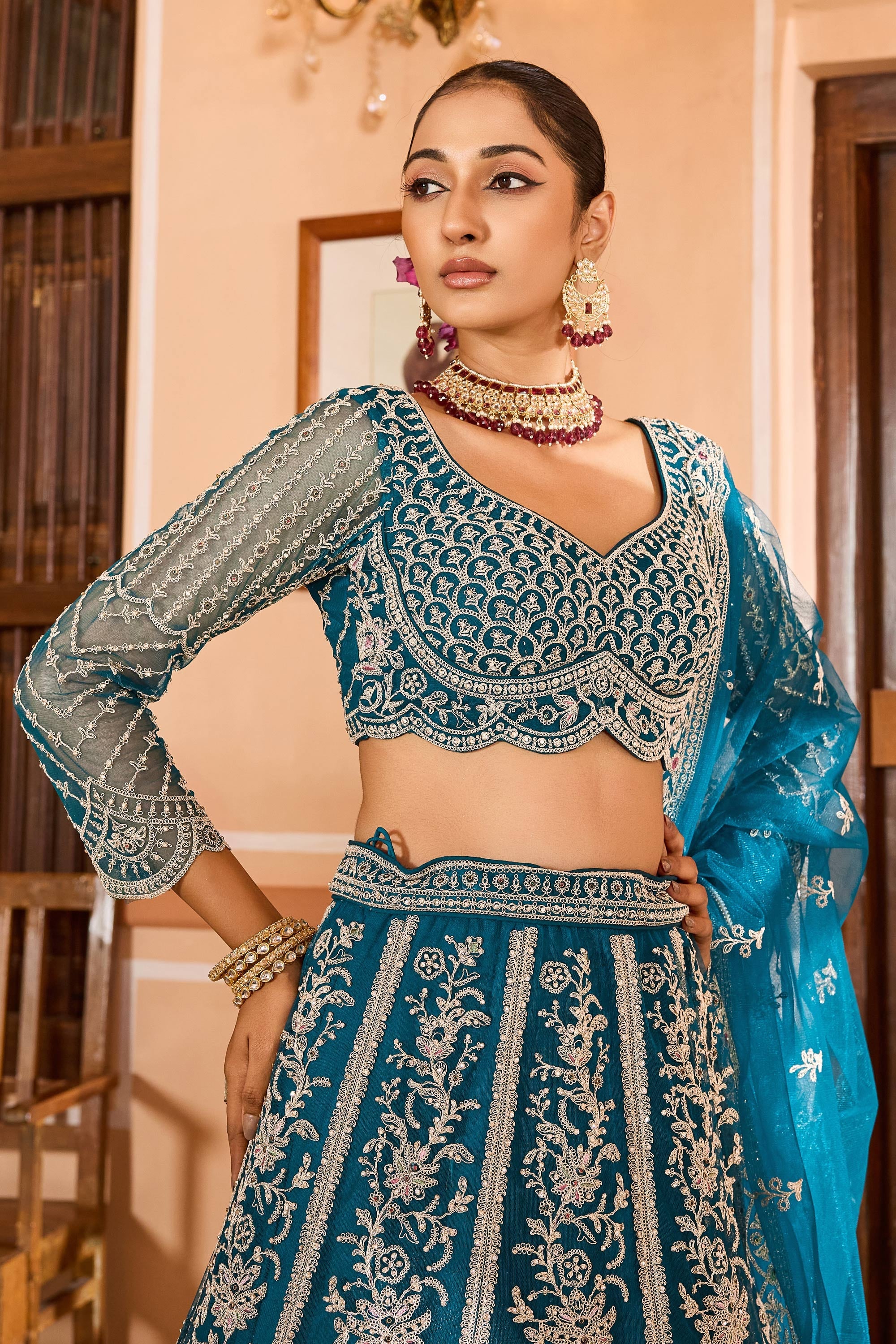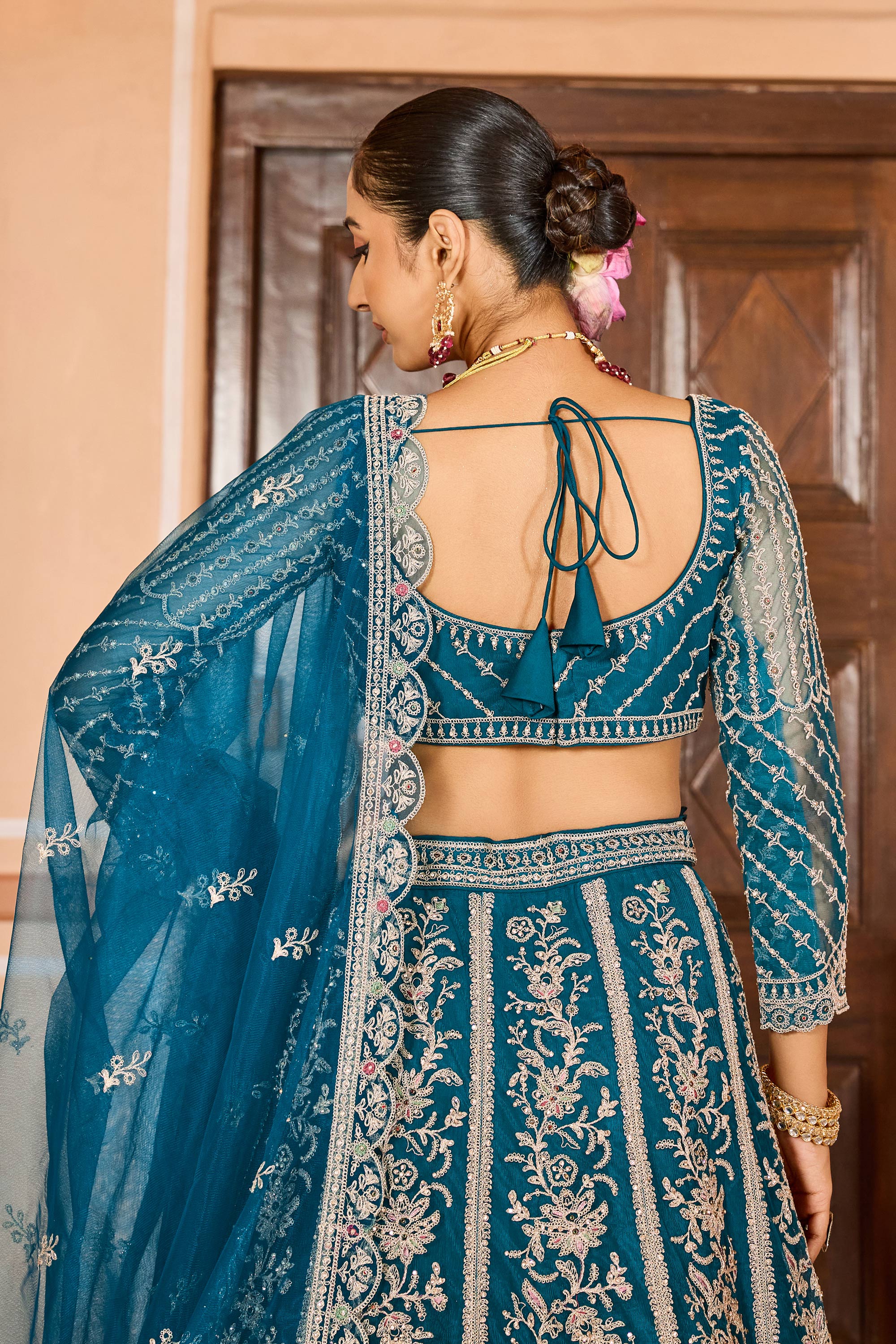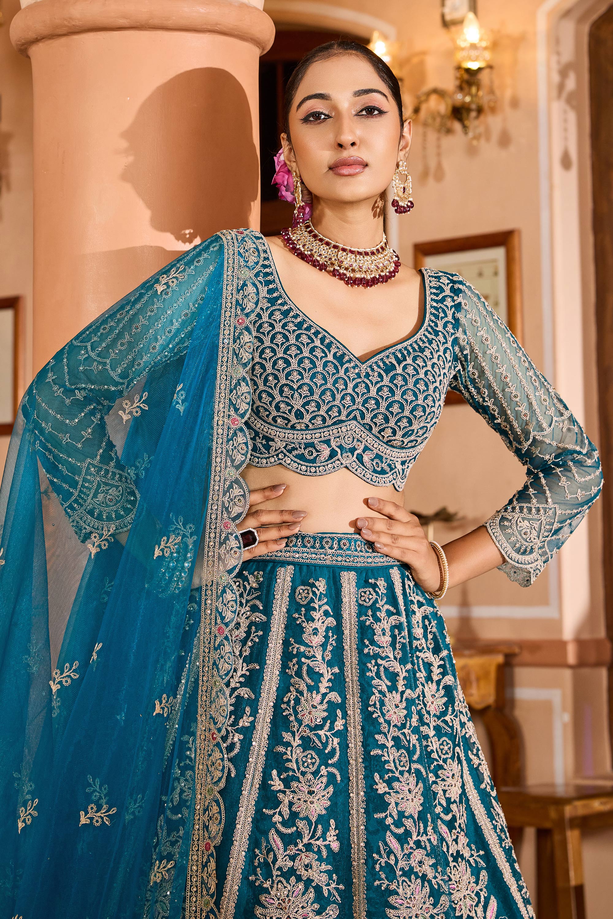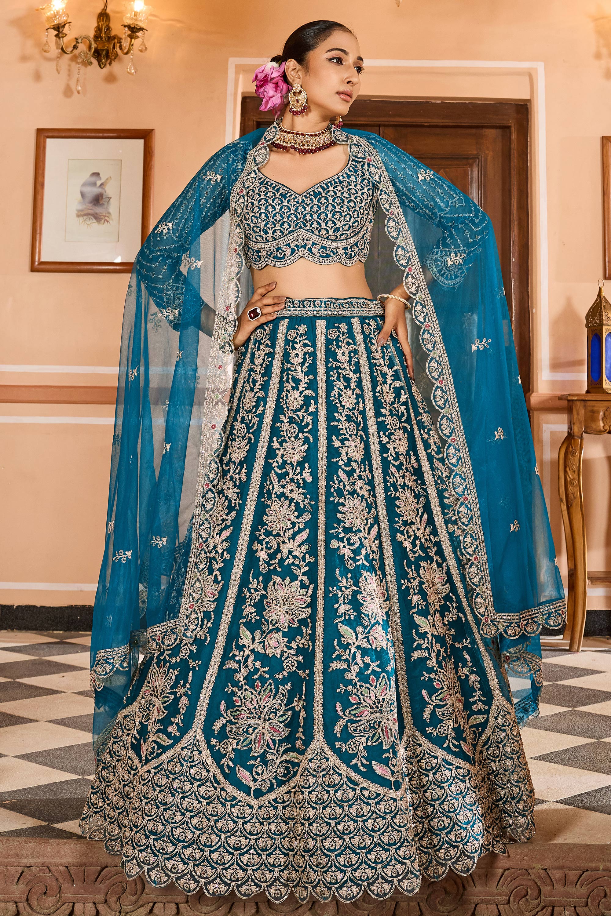 Teal Net Fabric Wedding Wear Lehenga Choli