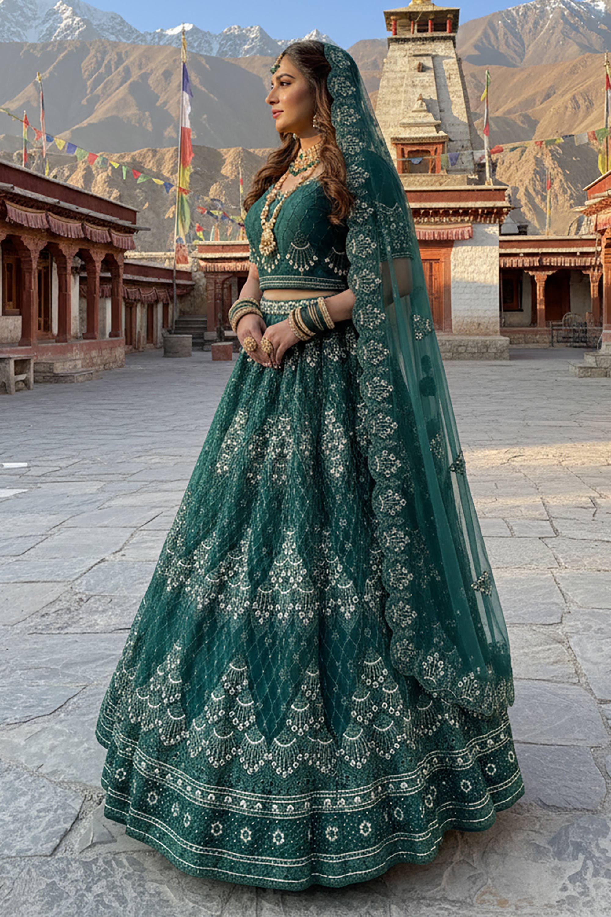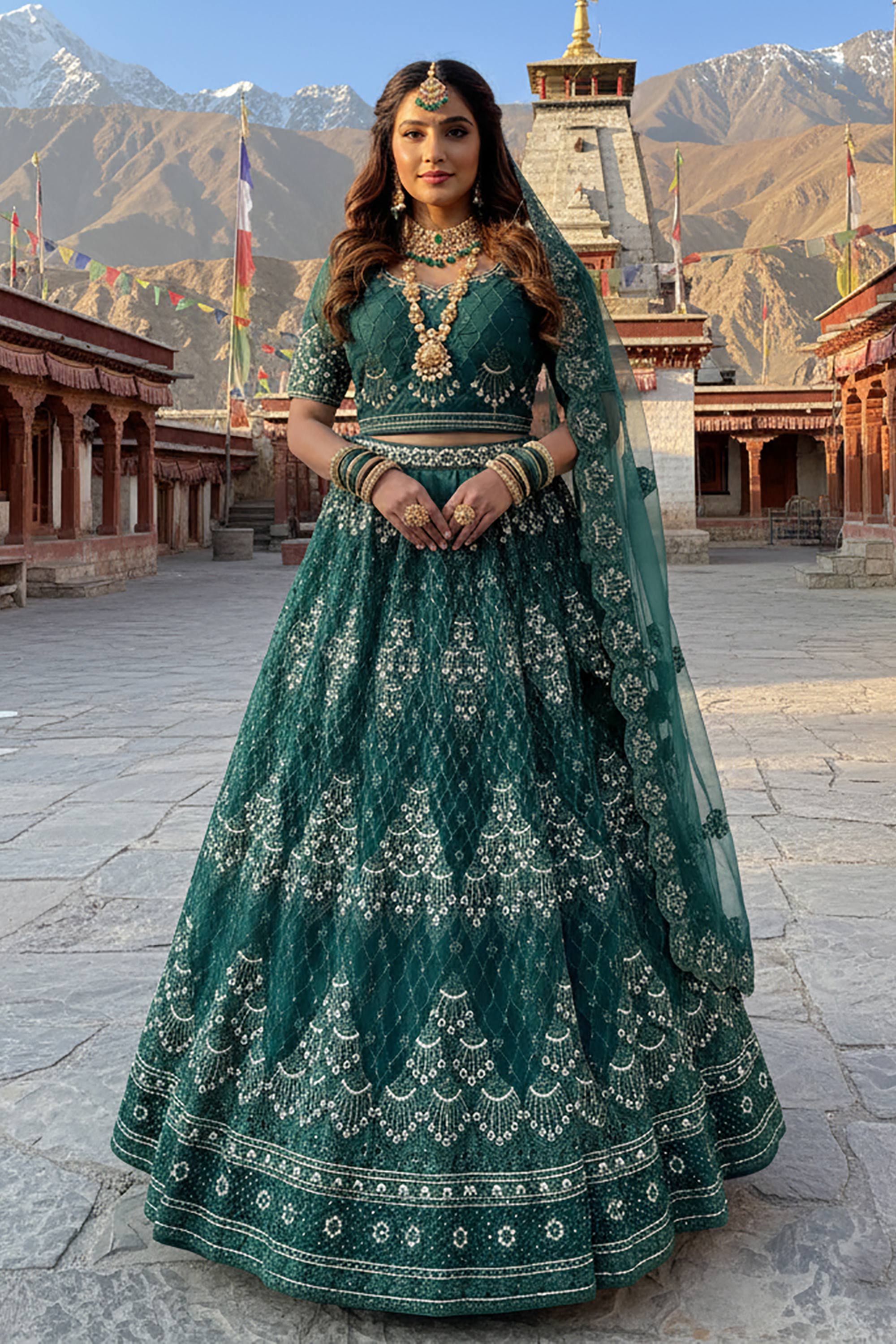 Teal Wedding Wear Embroidered Net Lehenga Choli With Dupatta