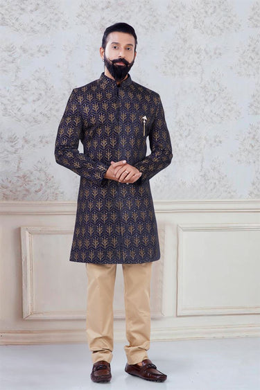 Pretty Navy Blue Velvet Fabric Wedding Indowestern For Men