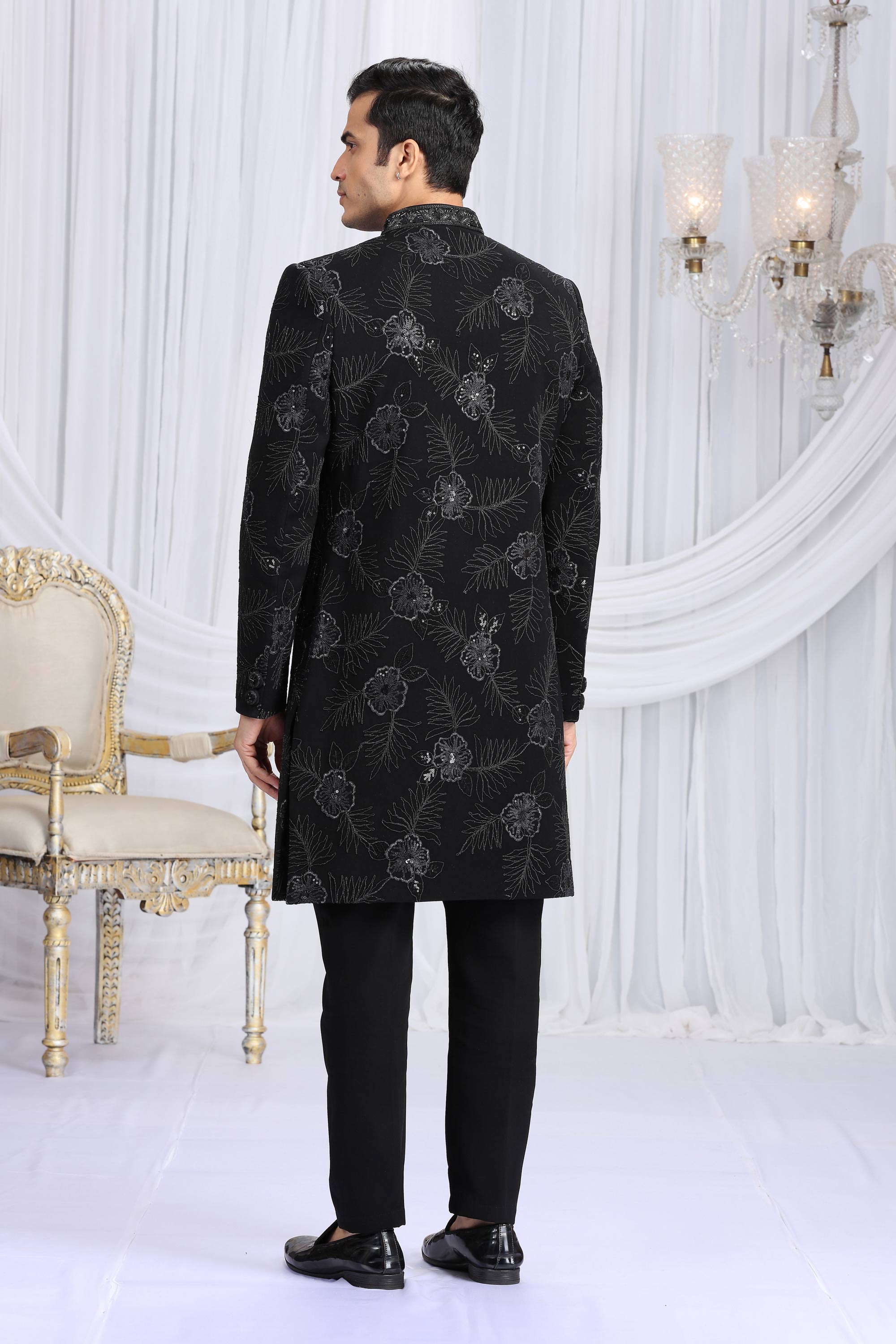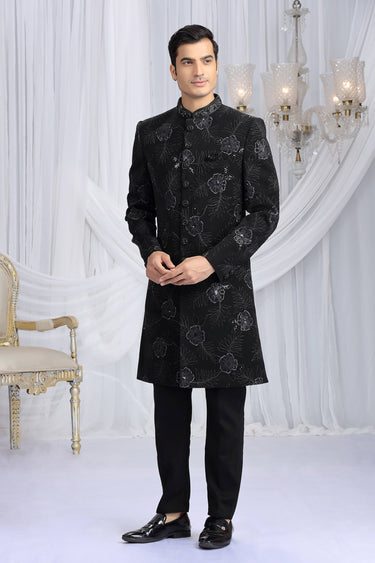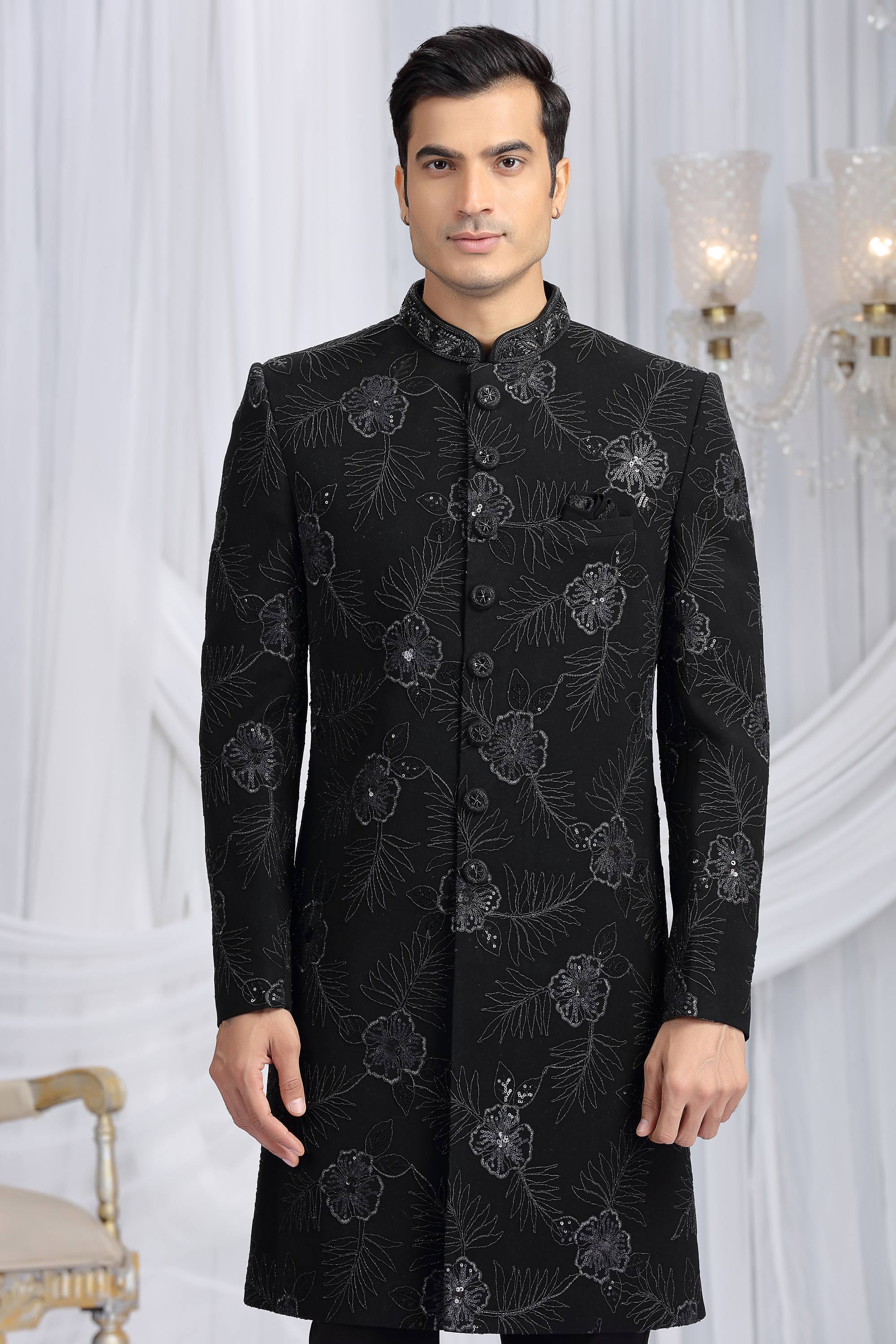 Art Silk Embroidered Black Wedding Wear Indo Western For Men