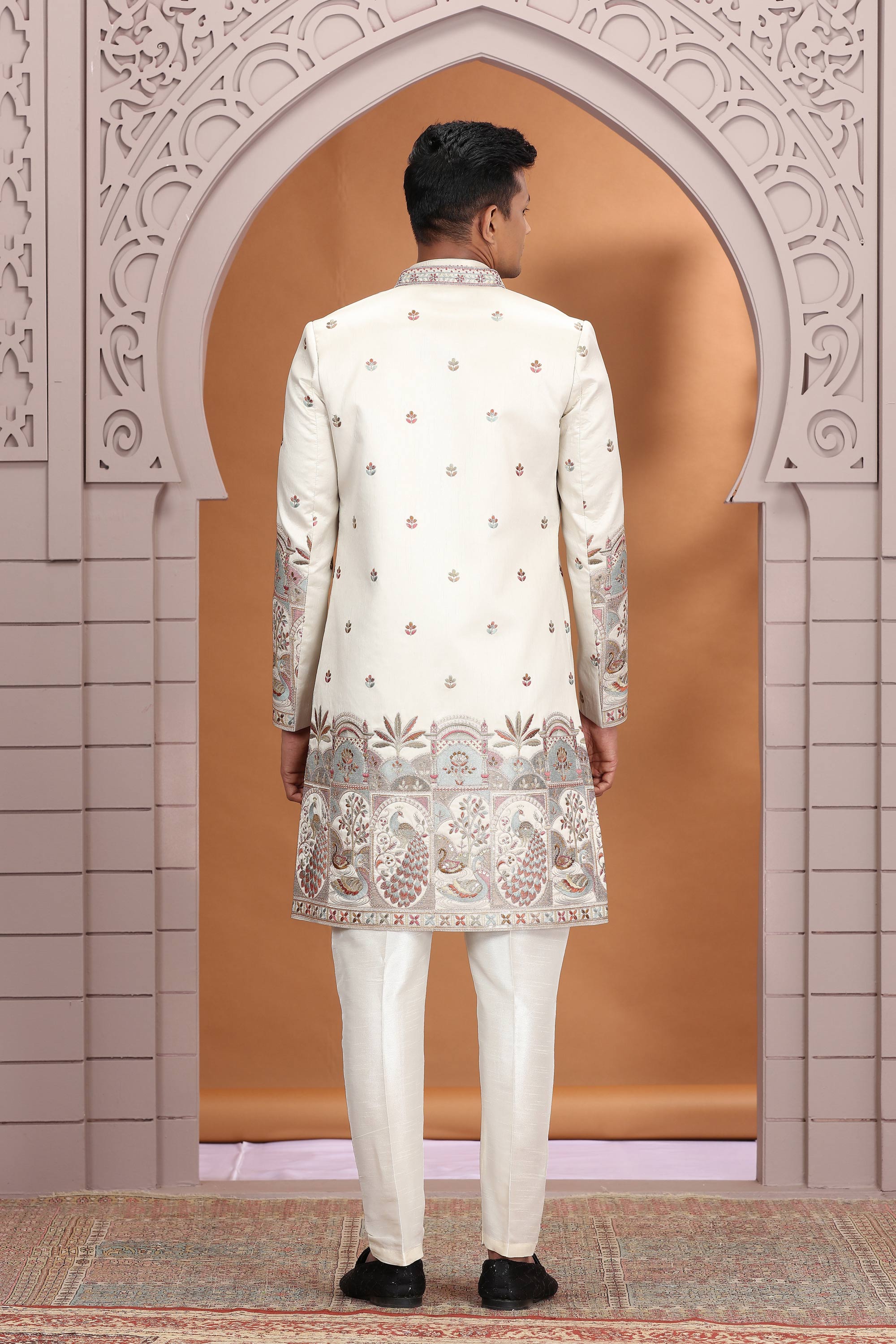 Beige Art Silk Readymade 3 Piece Indo Western For Men