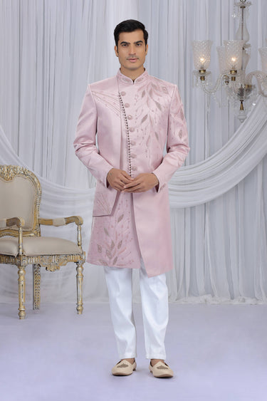 Embroidered Art Silk Pink Readymade Indo Western For Men