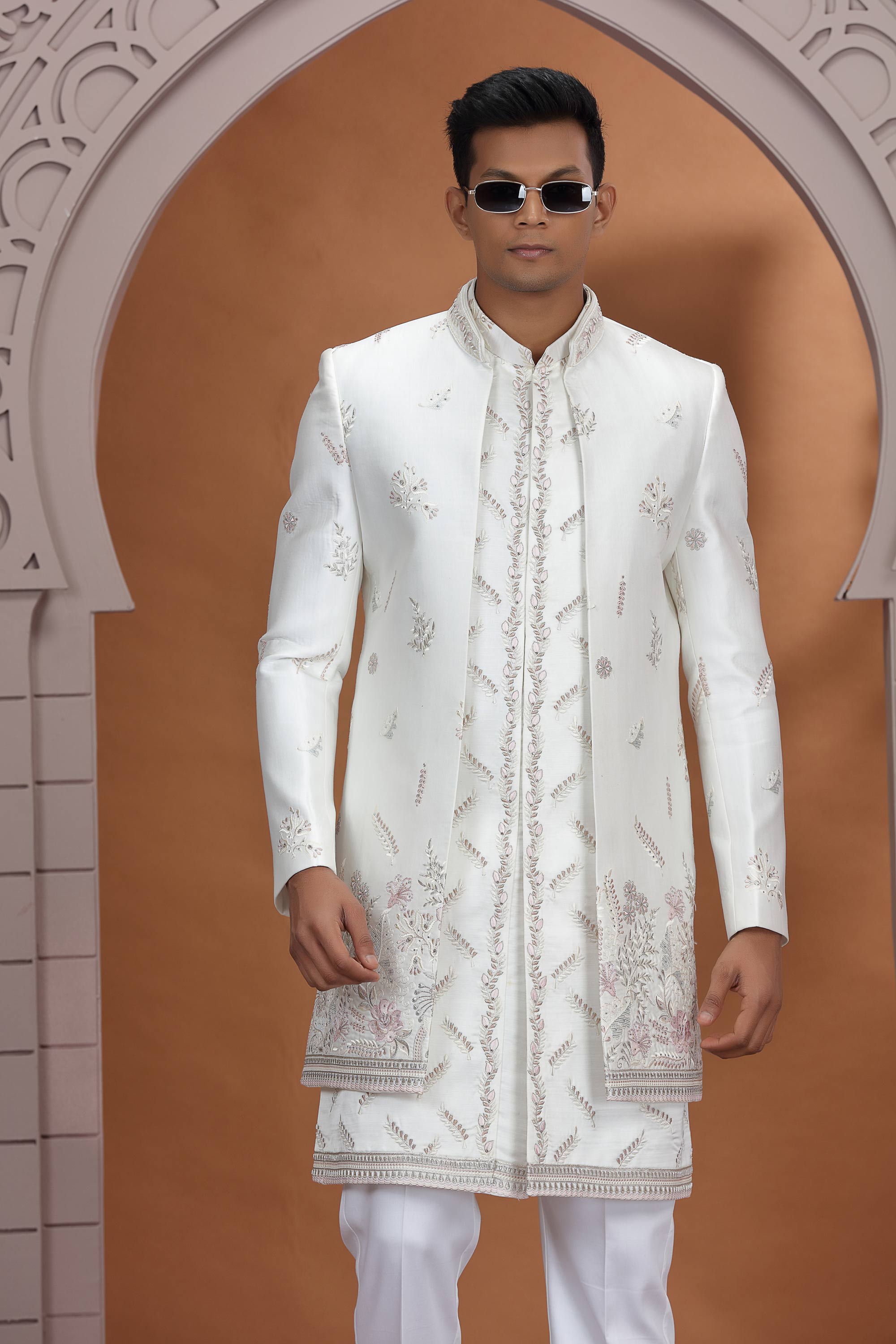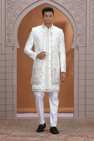 Embroidery Art Silk White Wedding Wear 3 Piece Indo Western For Men