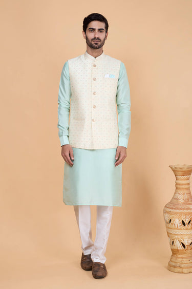 Jacquard Silk Sea Green Men Readymade Kurta And Aligadhi Pant For Wedding Wear