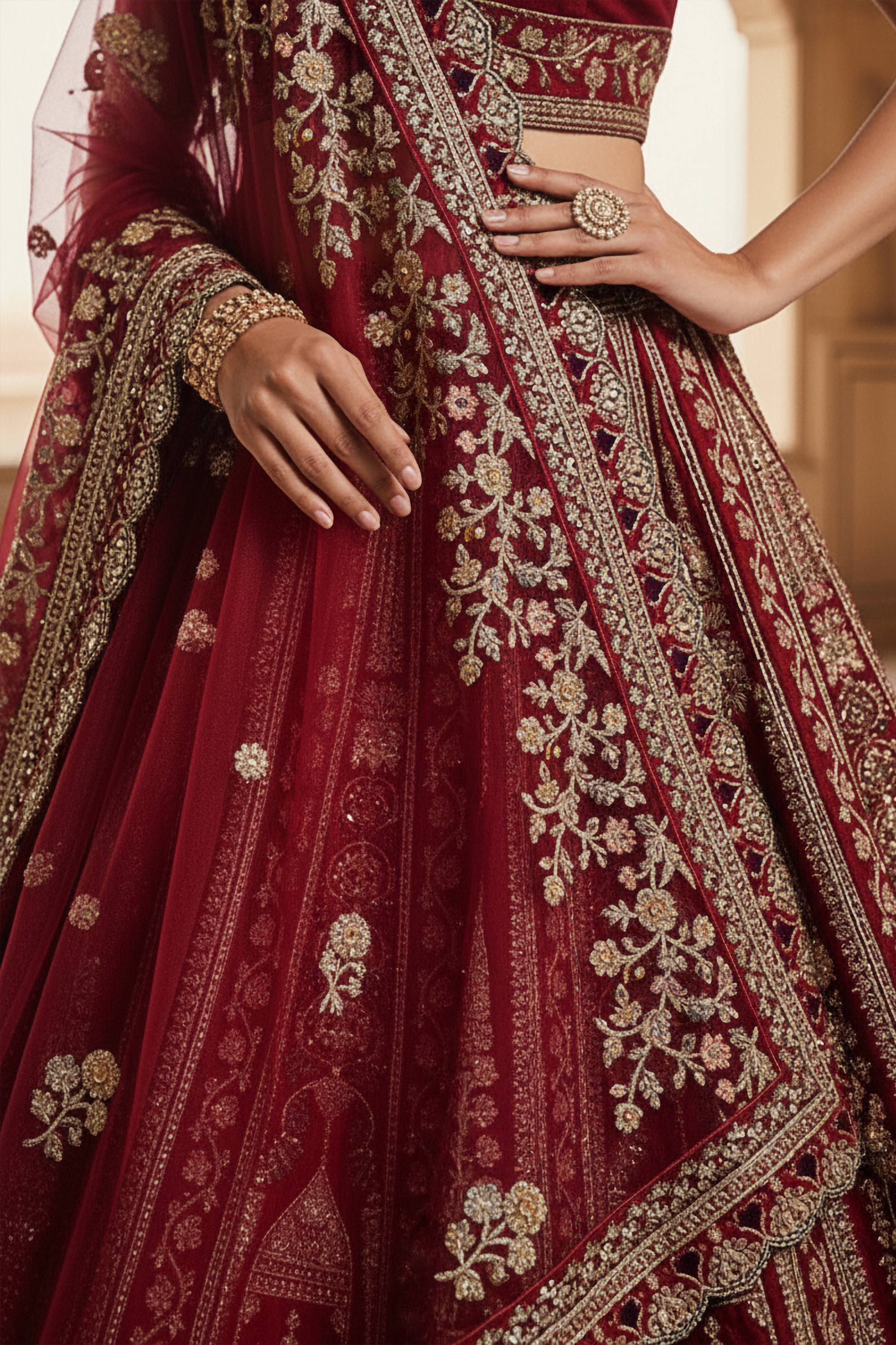Step into elegance with this designer silk bridal lehenga choli. Its refined silk base provides a luxurious look, paired with detailed hand embroidery to add a regal touch. The set features an intricate pattern that is ideal for brides aiming to look timelessly sophisticated on their special day. This lehenga combines exceptional quality with flawless craftsmanship, offering both style and durability. Its beautiful color and detailed work enhance your wedding experience, giving you a standout look to cherish in every photo and memory. Ideal for weddings or festive celebrations, its a one-of-a-kind outfit to embrace your day in grace.