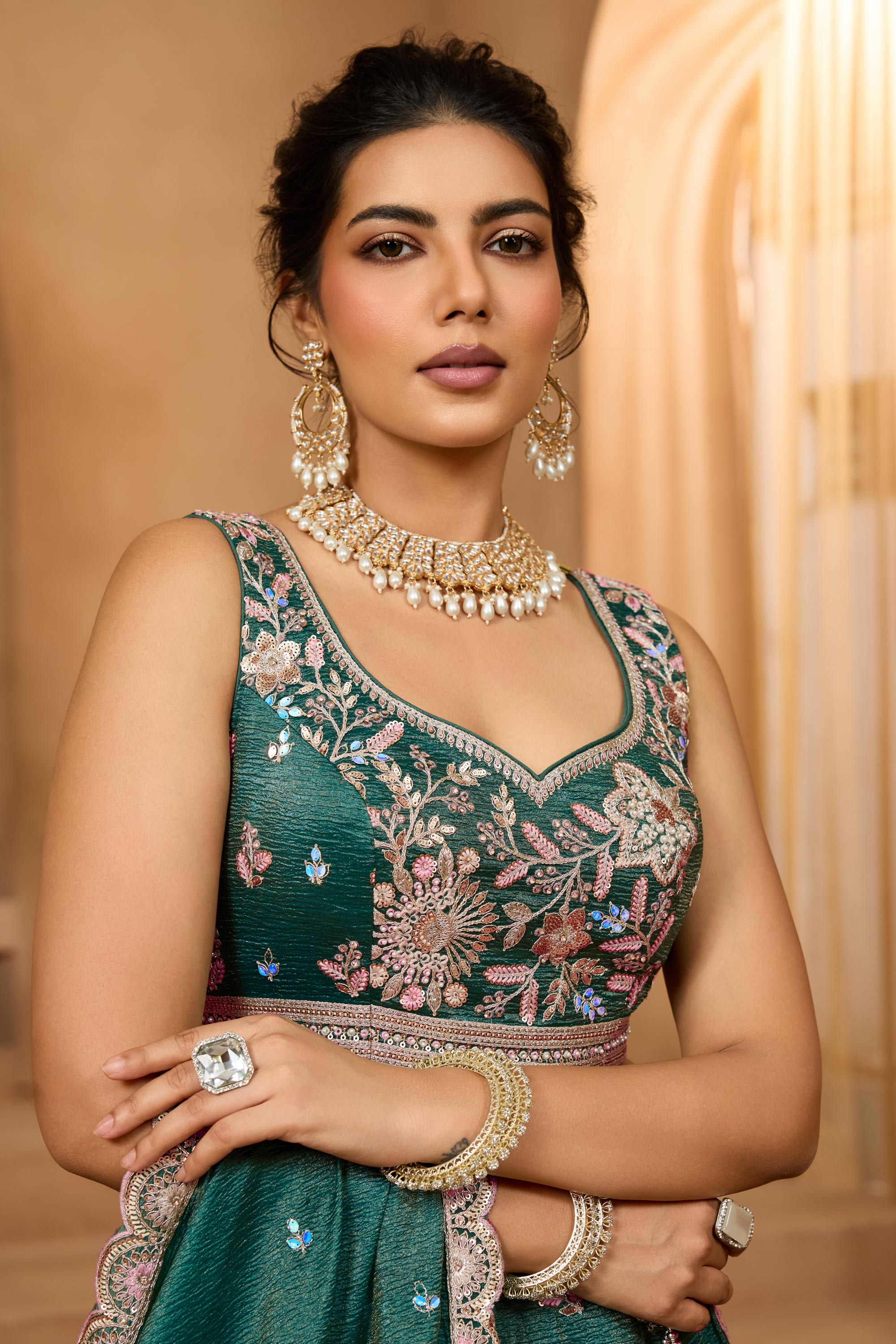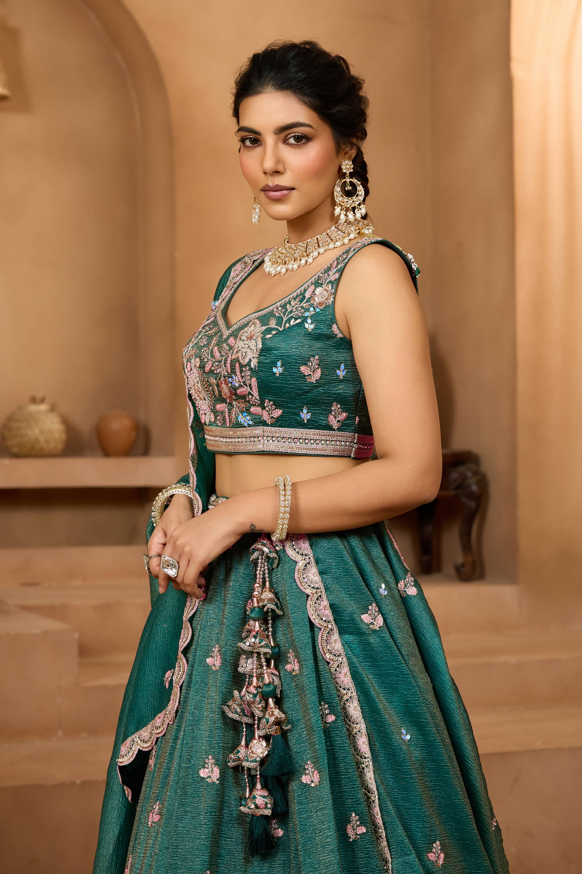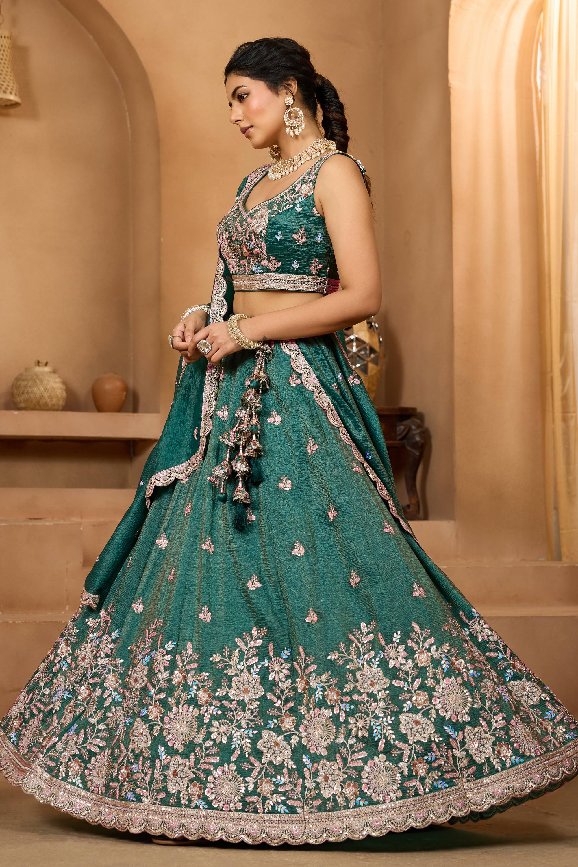 Dark Green Wedding Wear Embroidered Tissue Lehenga Choli