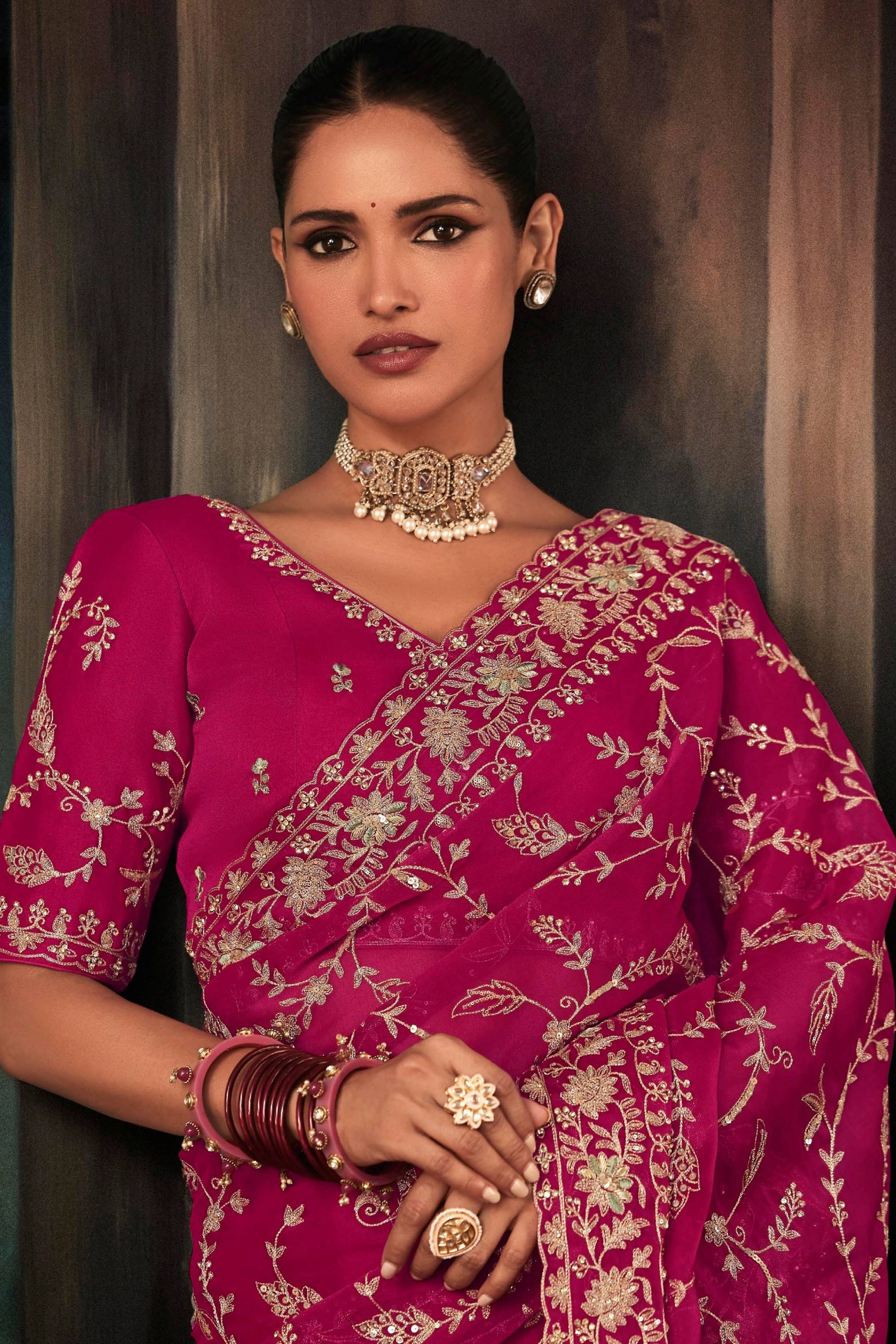 Magenta Wedding Wear Fancy Fabric Embroidered Saree