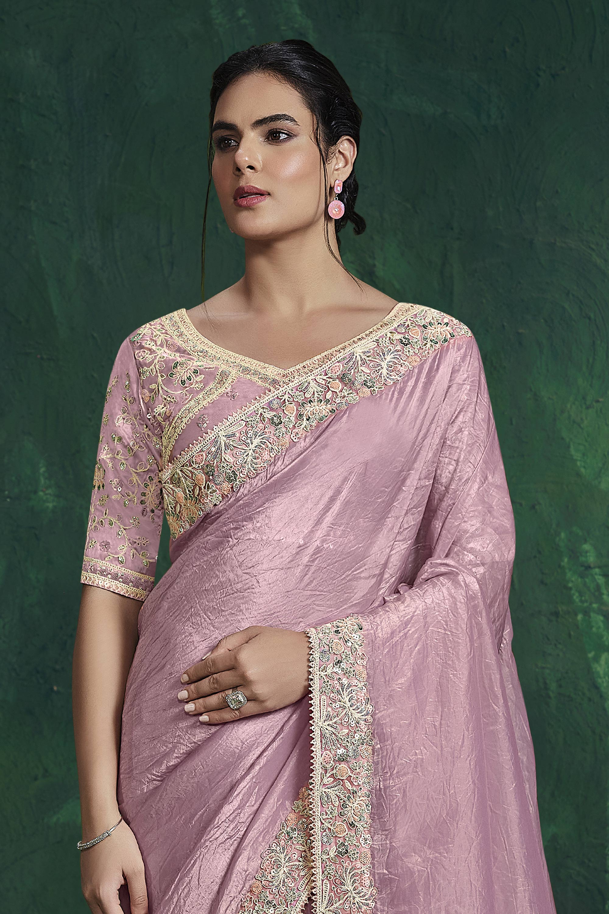 Make a stunning statement at weddings with this elegant readymade designer saree. The finely crafted embroidered border work gives it a luxurious finish, making it suitable for traditional and festive events. A timeless piece that blends classic charm with modern style. Note: Due to digital photography and screen resolution, slight color variations may occur.