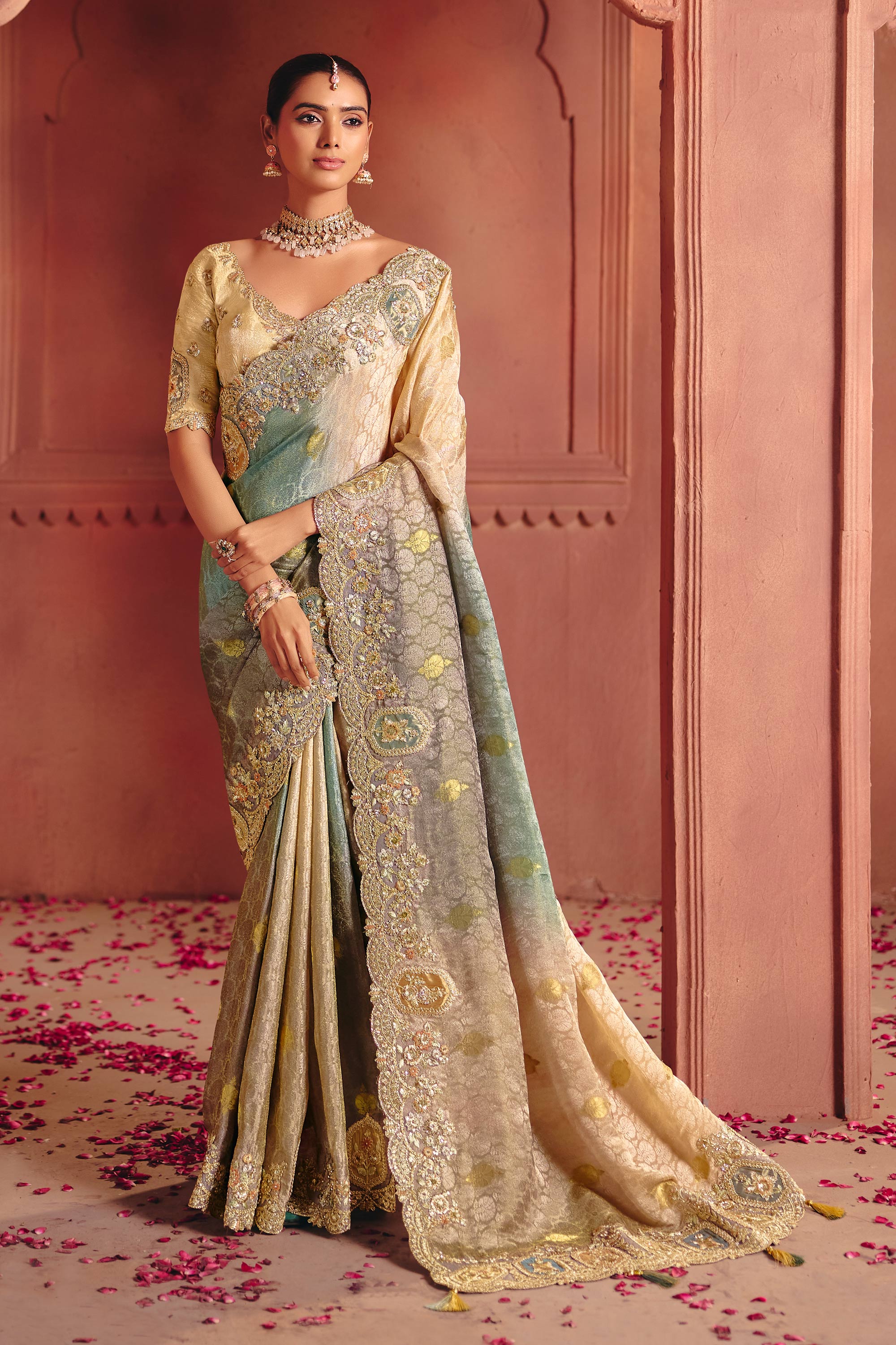Beige Wedding Wear Jacquard Fabric Embroidered Saree