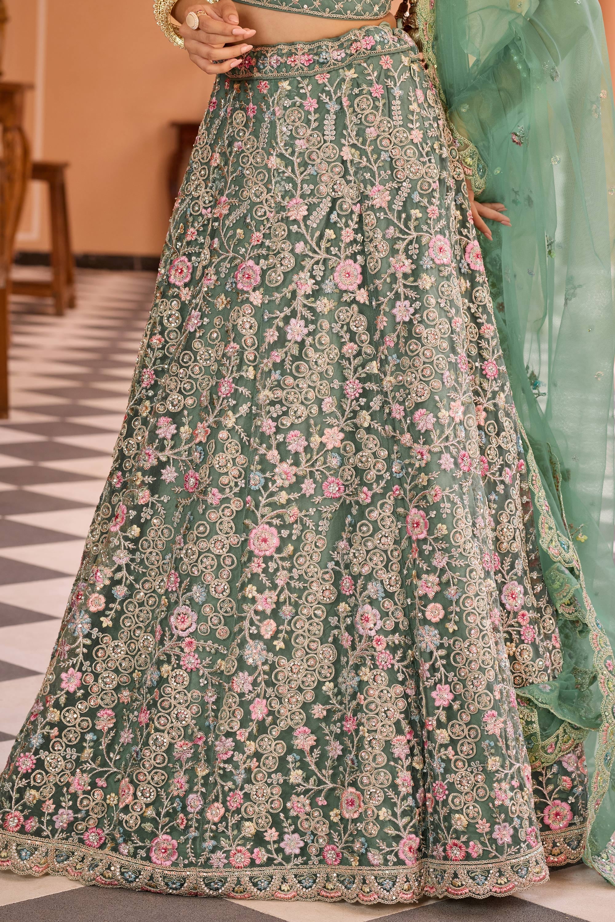 Embroidered Net Fabric Sea Green Lehenga Choli For Wedding Wear