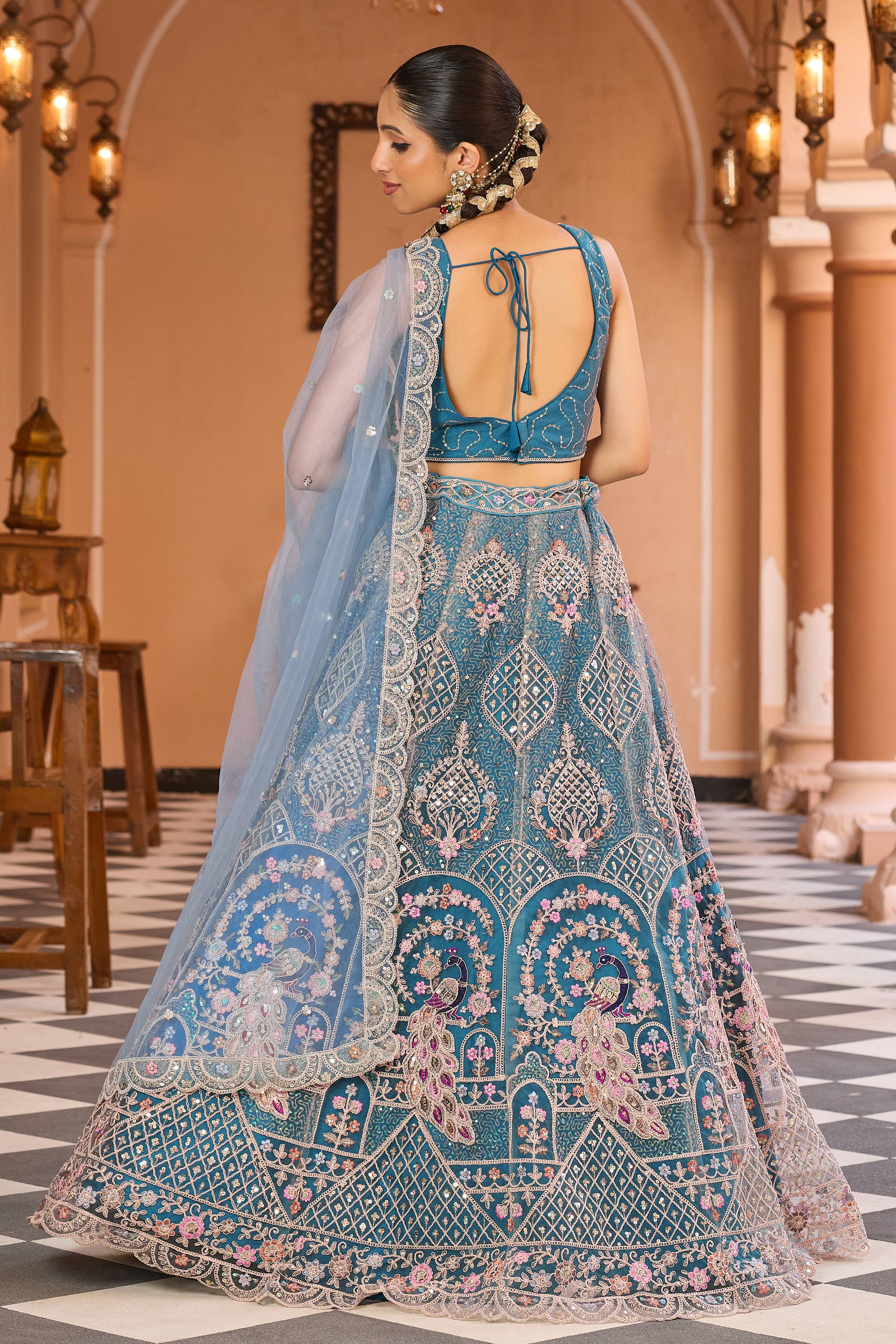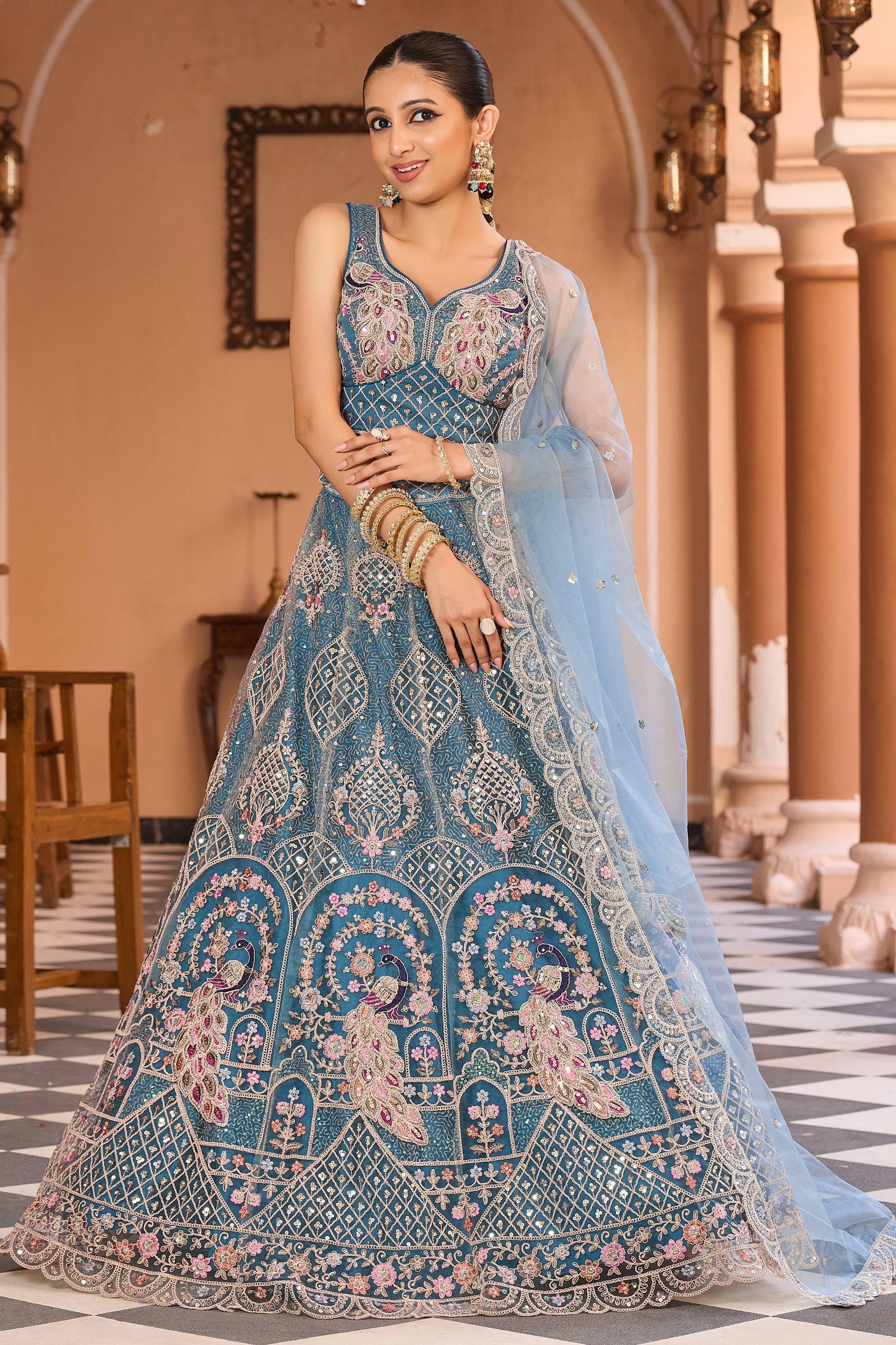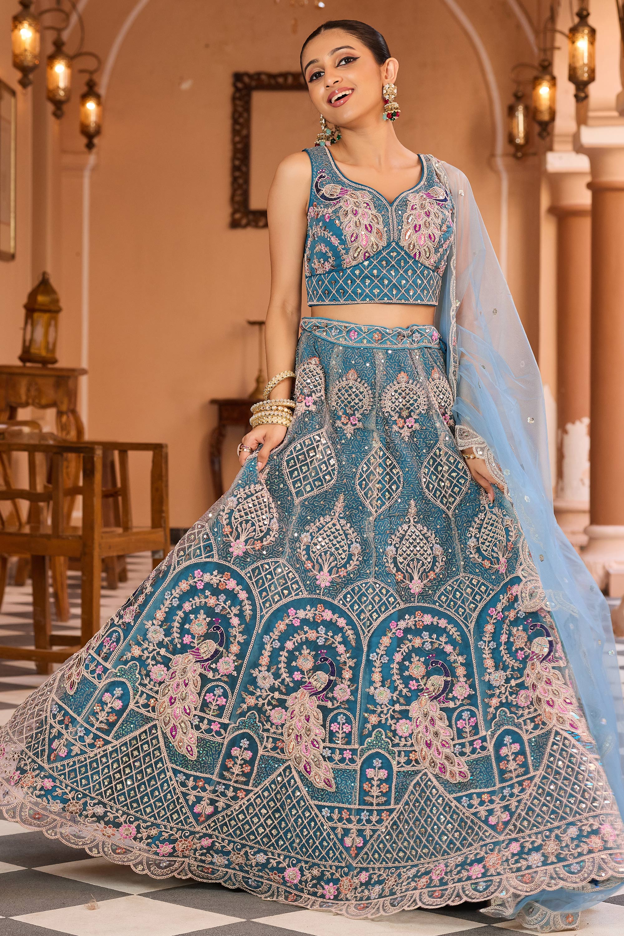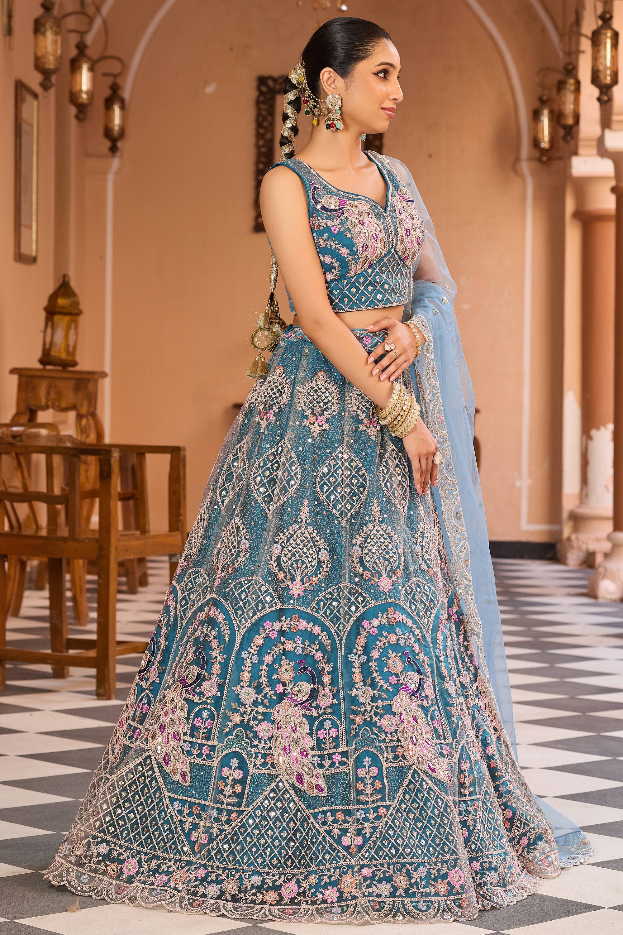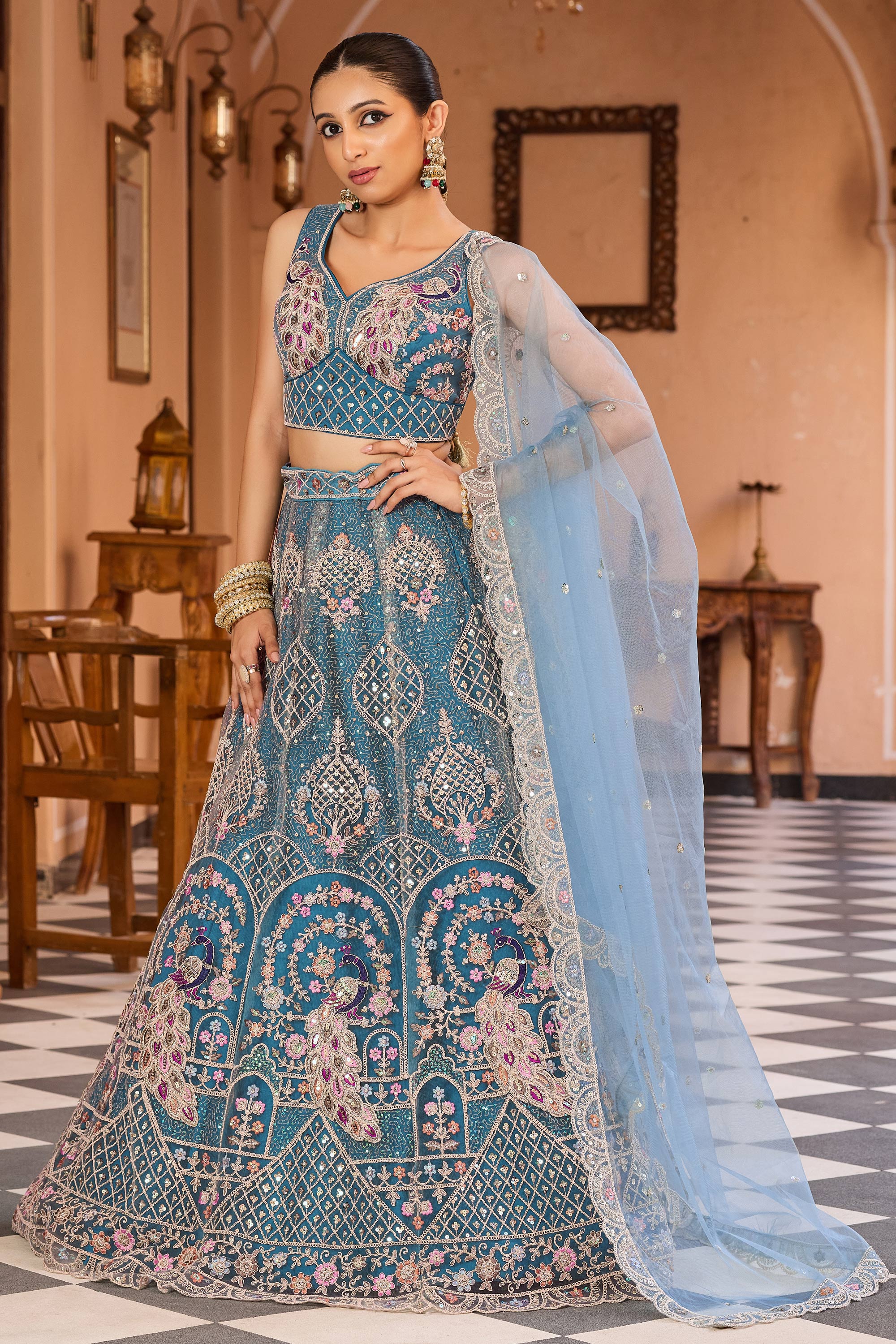 Embroidered Net Teal Wedding Wear Lehenga Choli With Dupatta