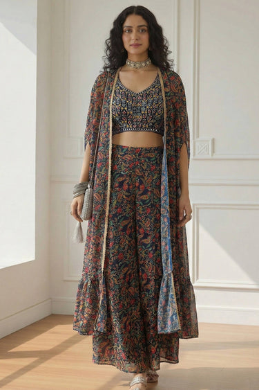 Georgette Crepe Fabric Multi Color Readymade Designer Palazzo Set With Designer Blouse And Shrug