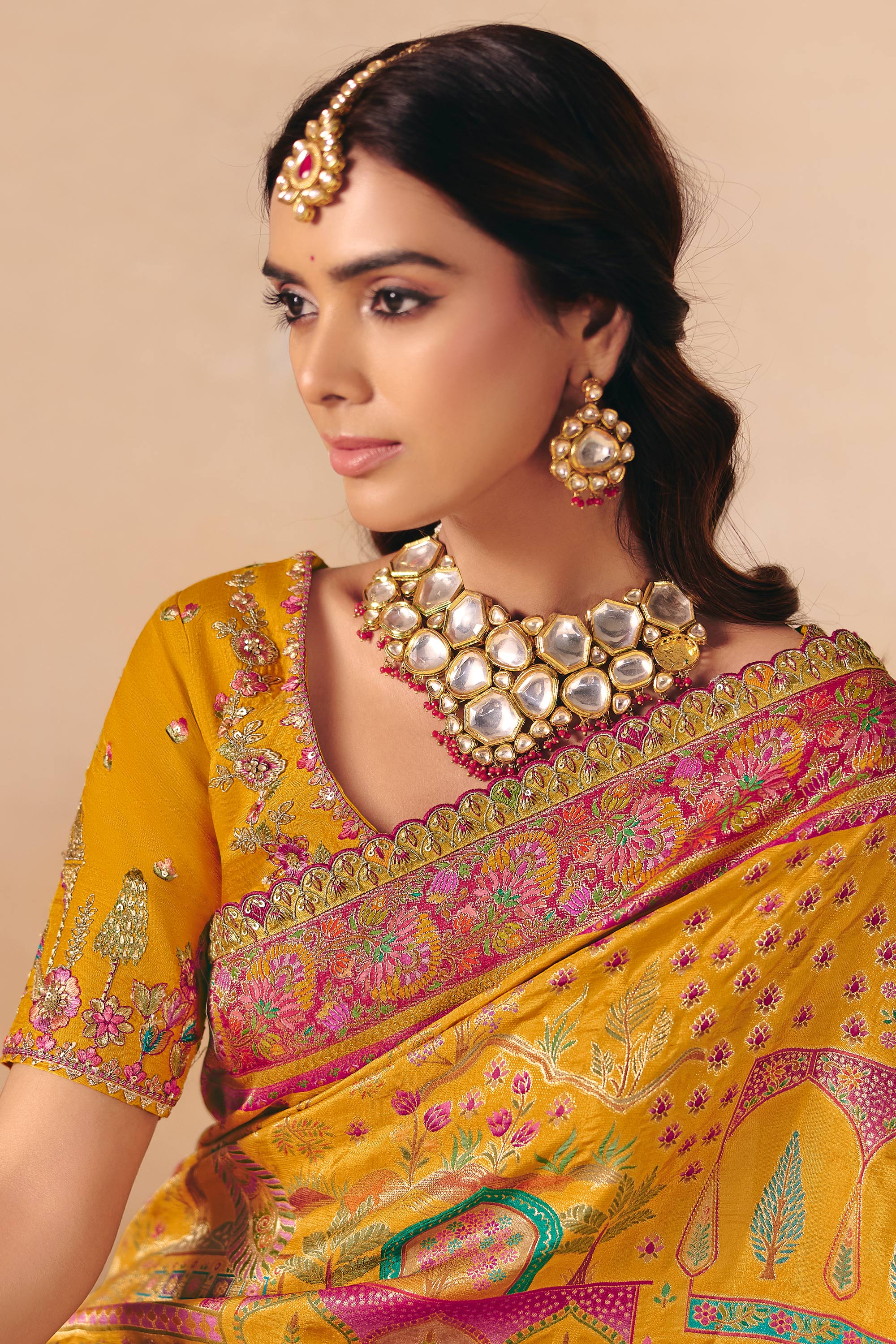 Mustard Sangeet Wear Silk Fabric Weaving Work Saree