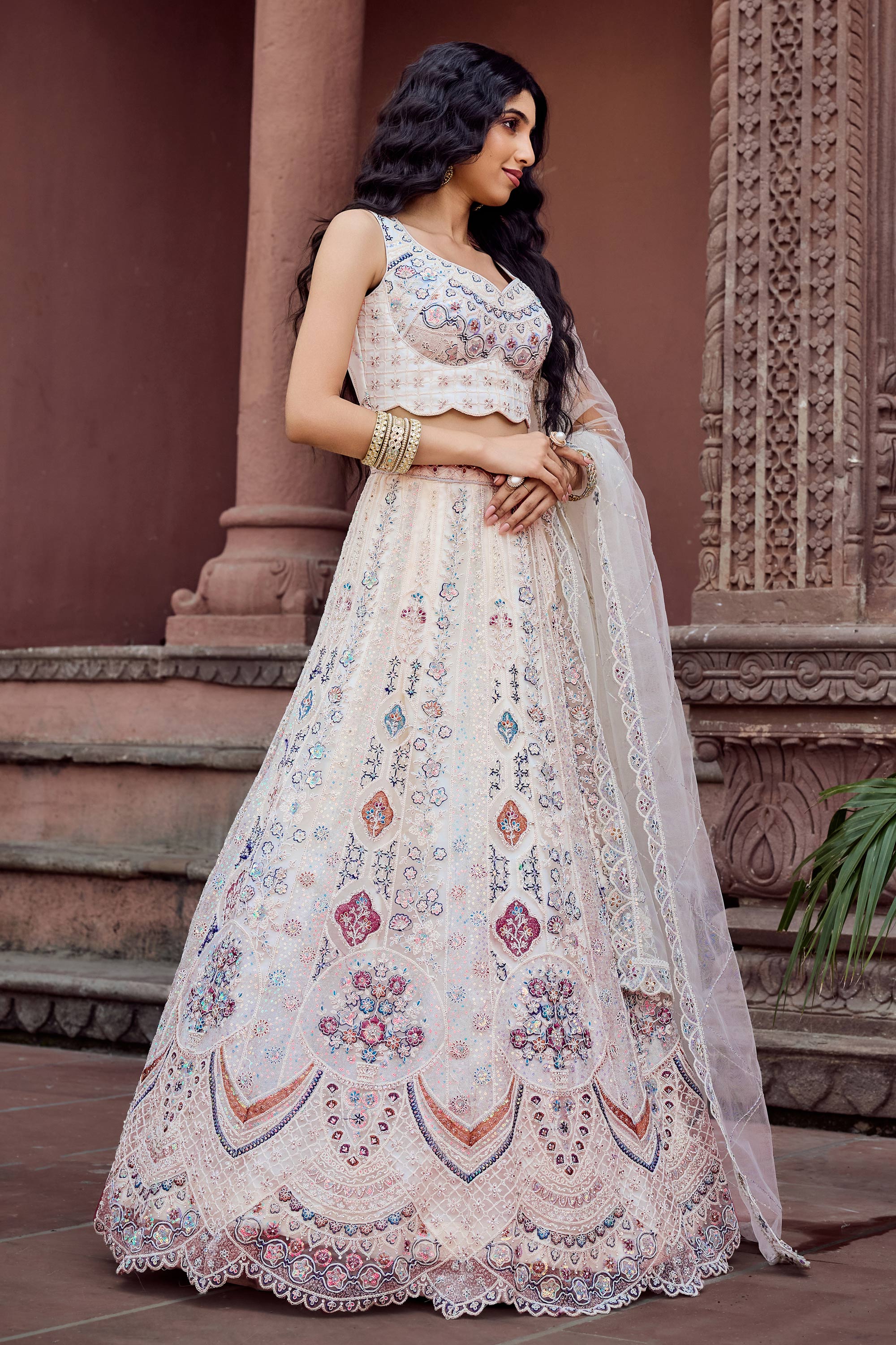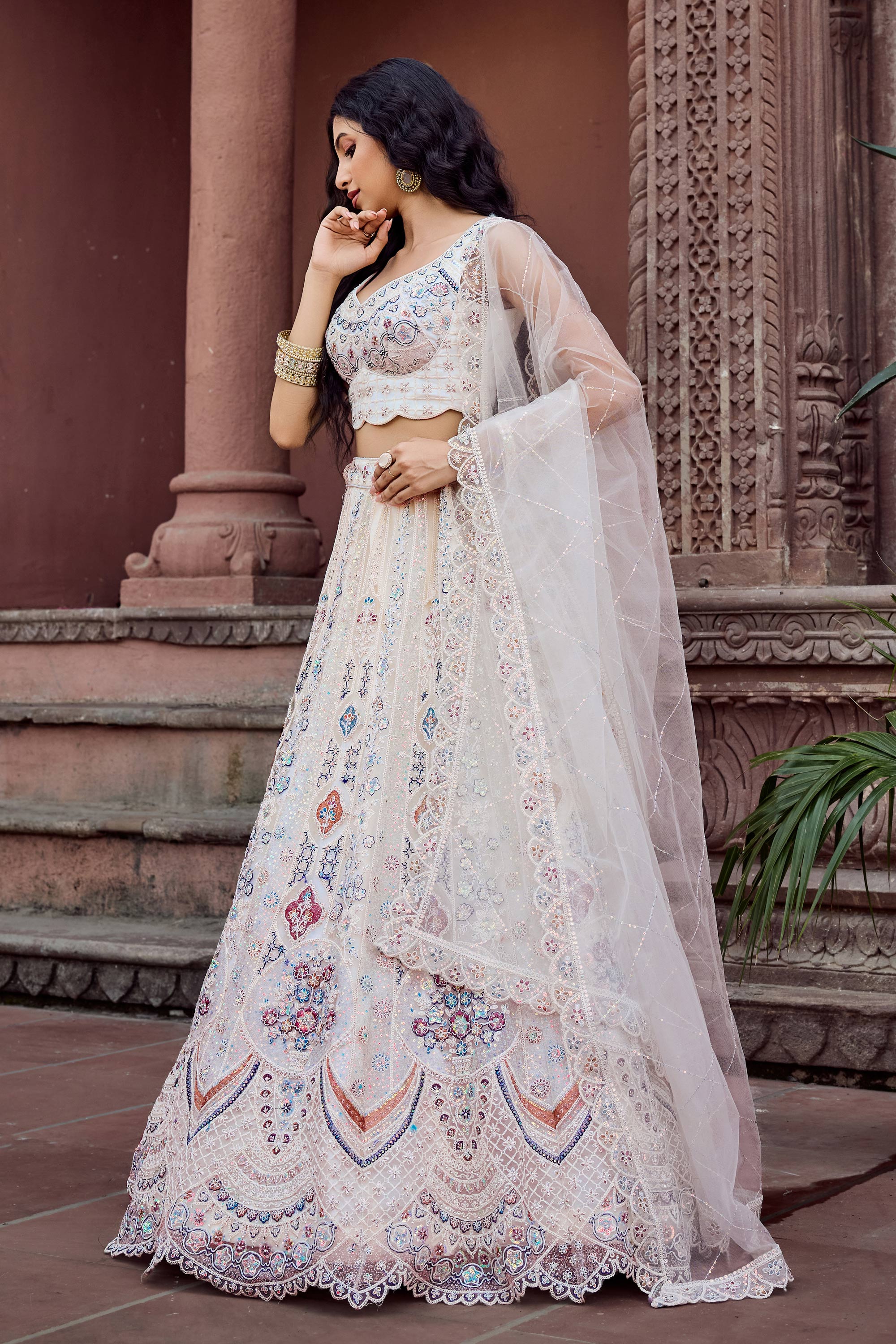Net Fabric Cream Wedding Wear Lehenga Choli With Dupatta