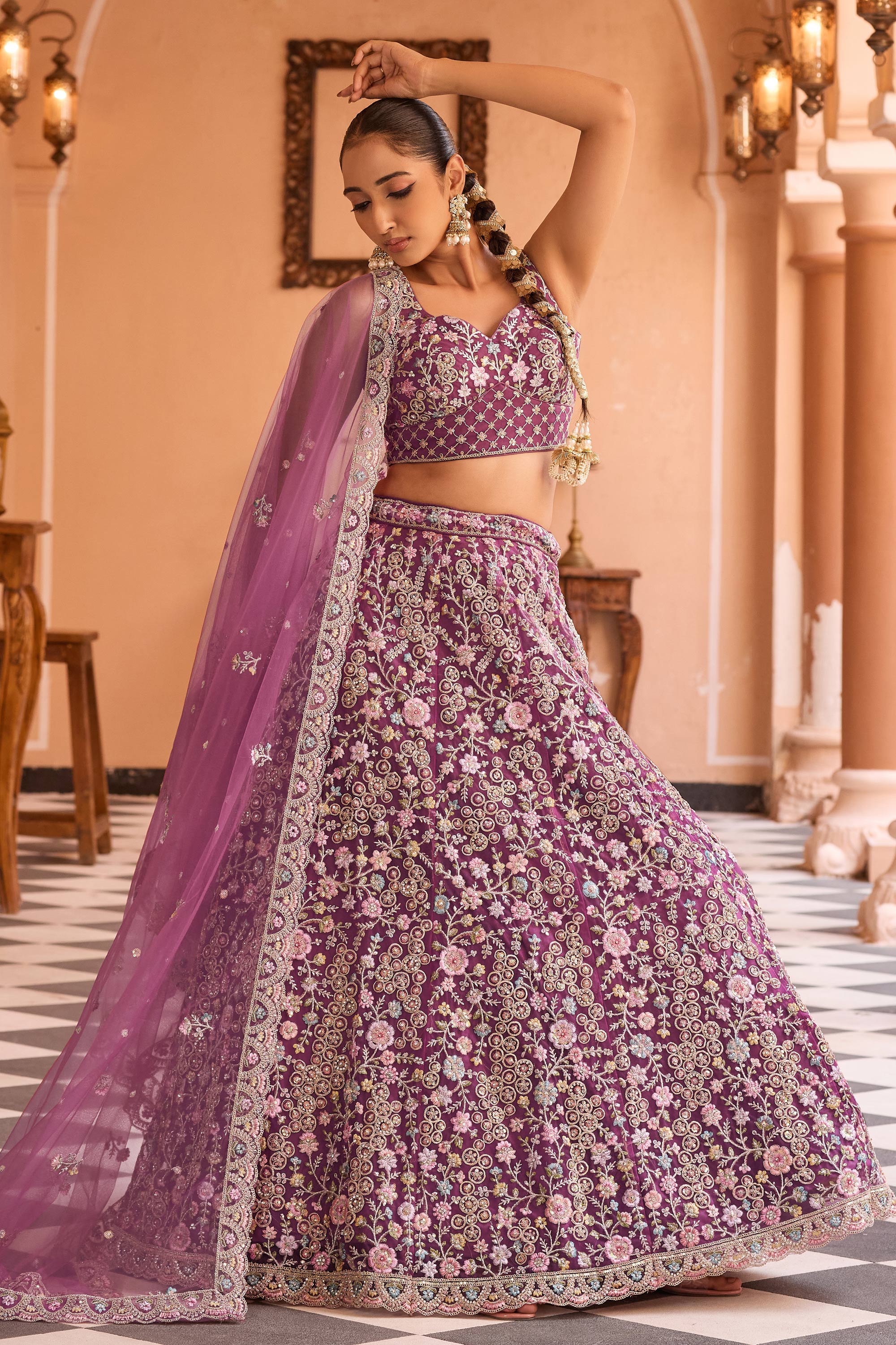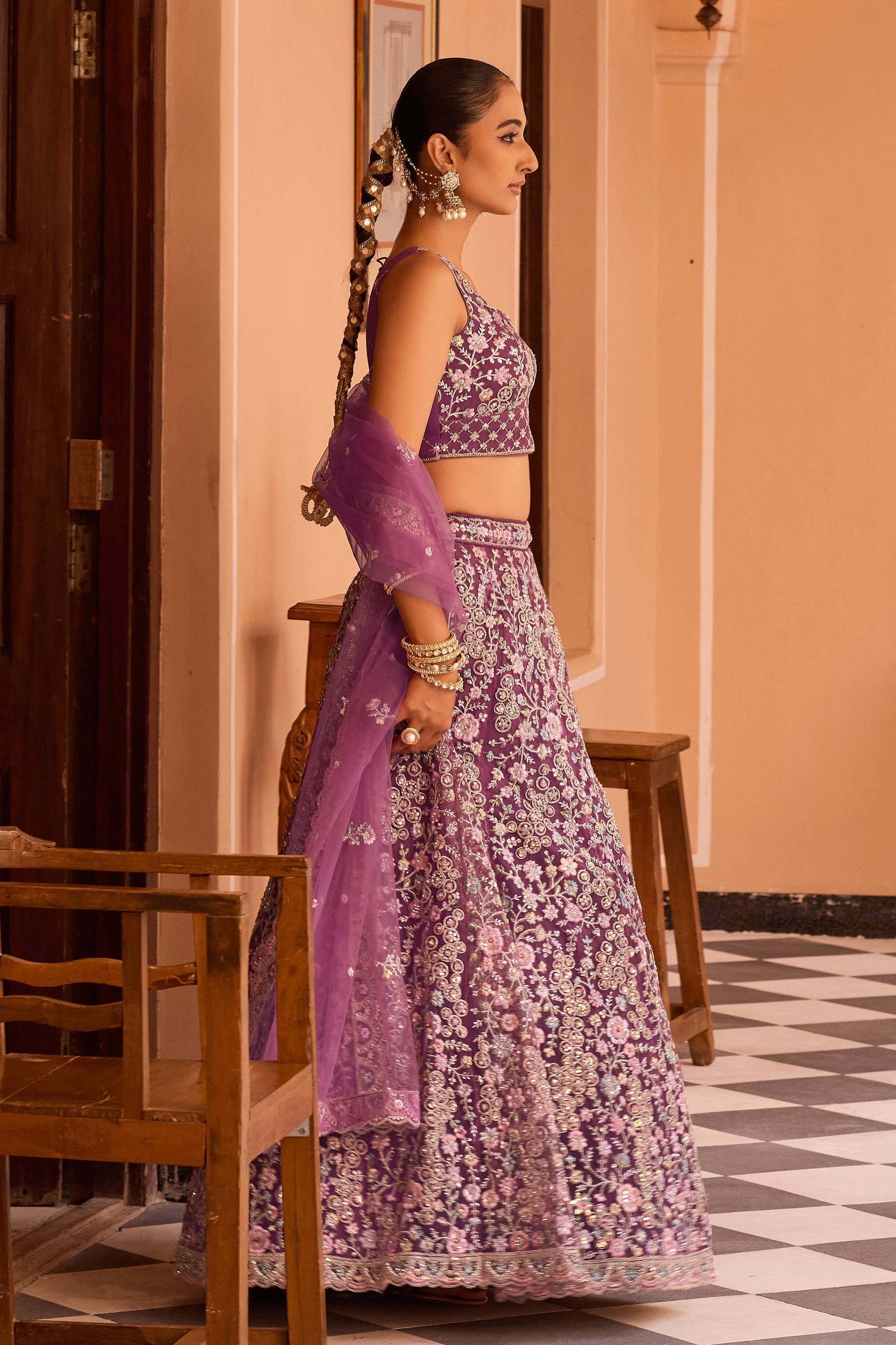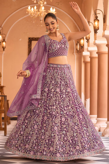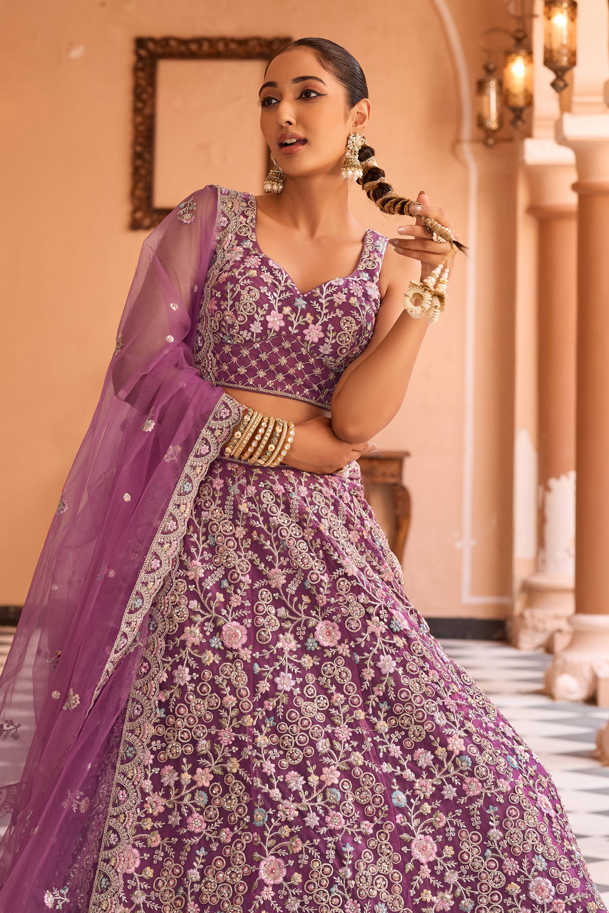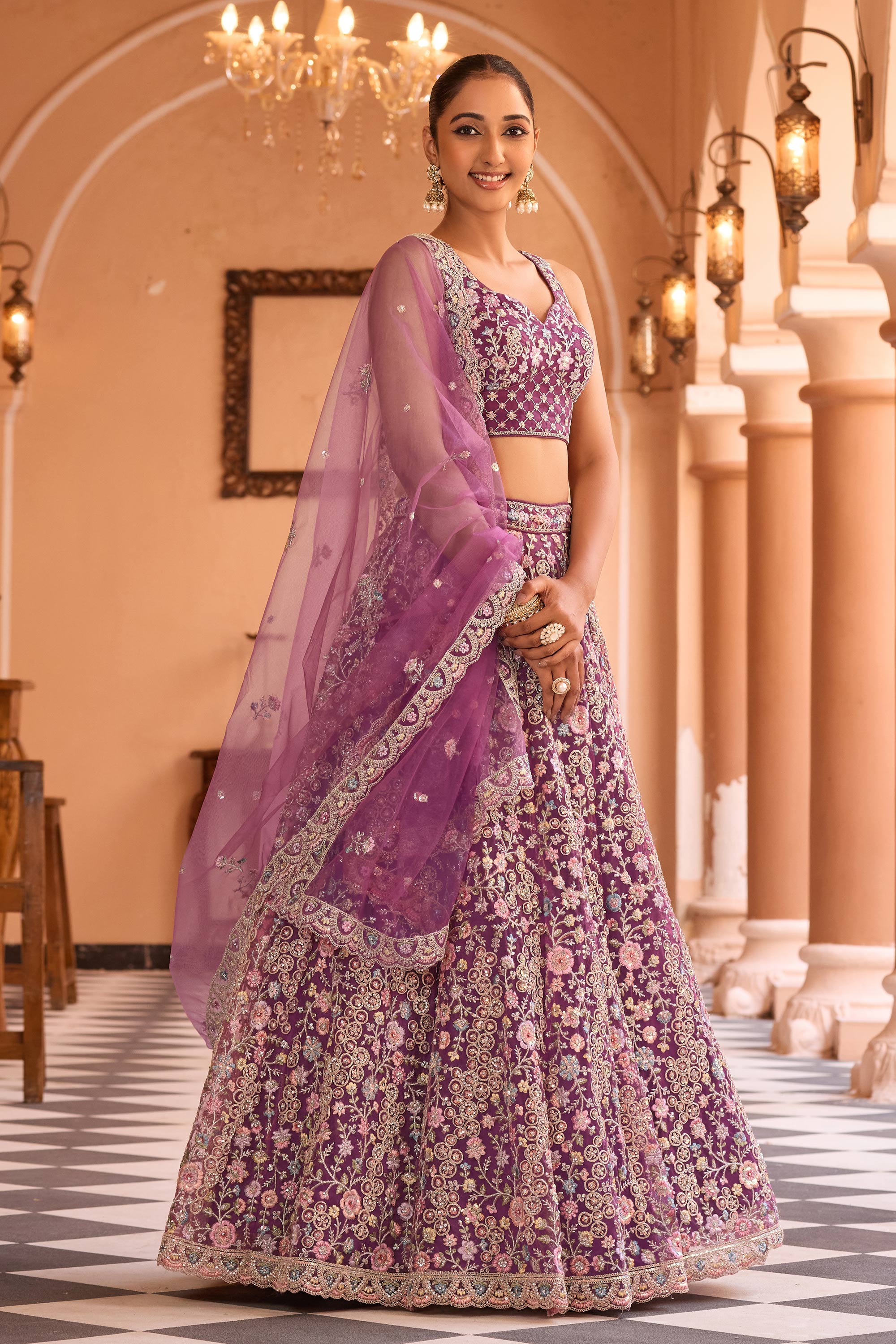 Purple Wedding Wear Net Fabric Embroidered Lehenga Choli
