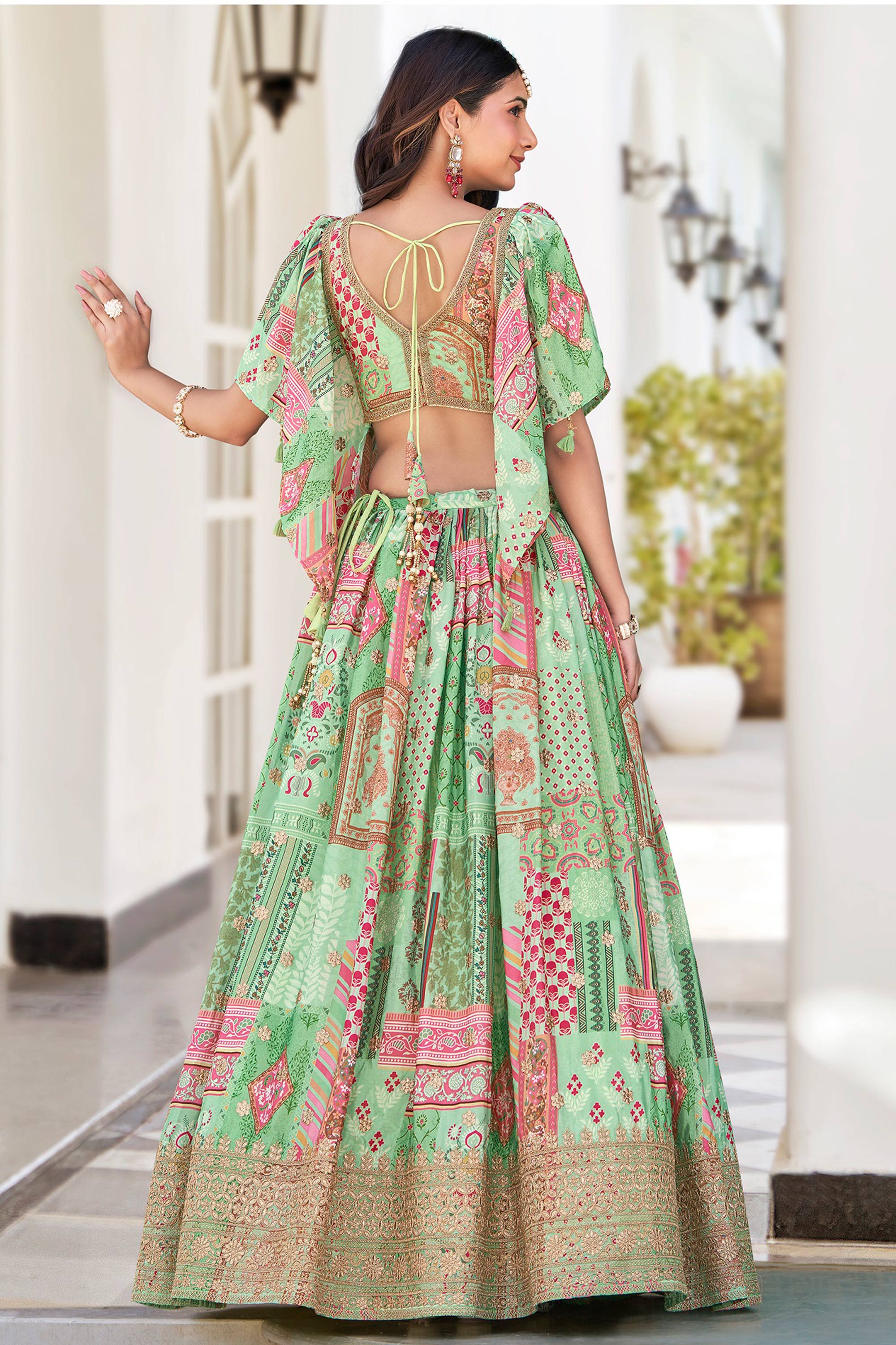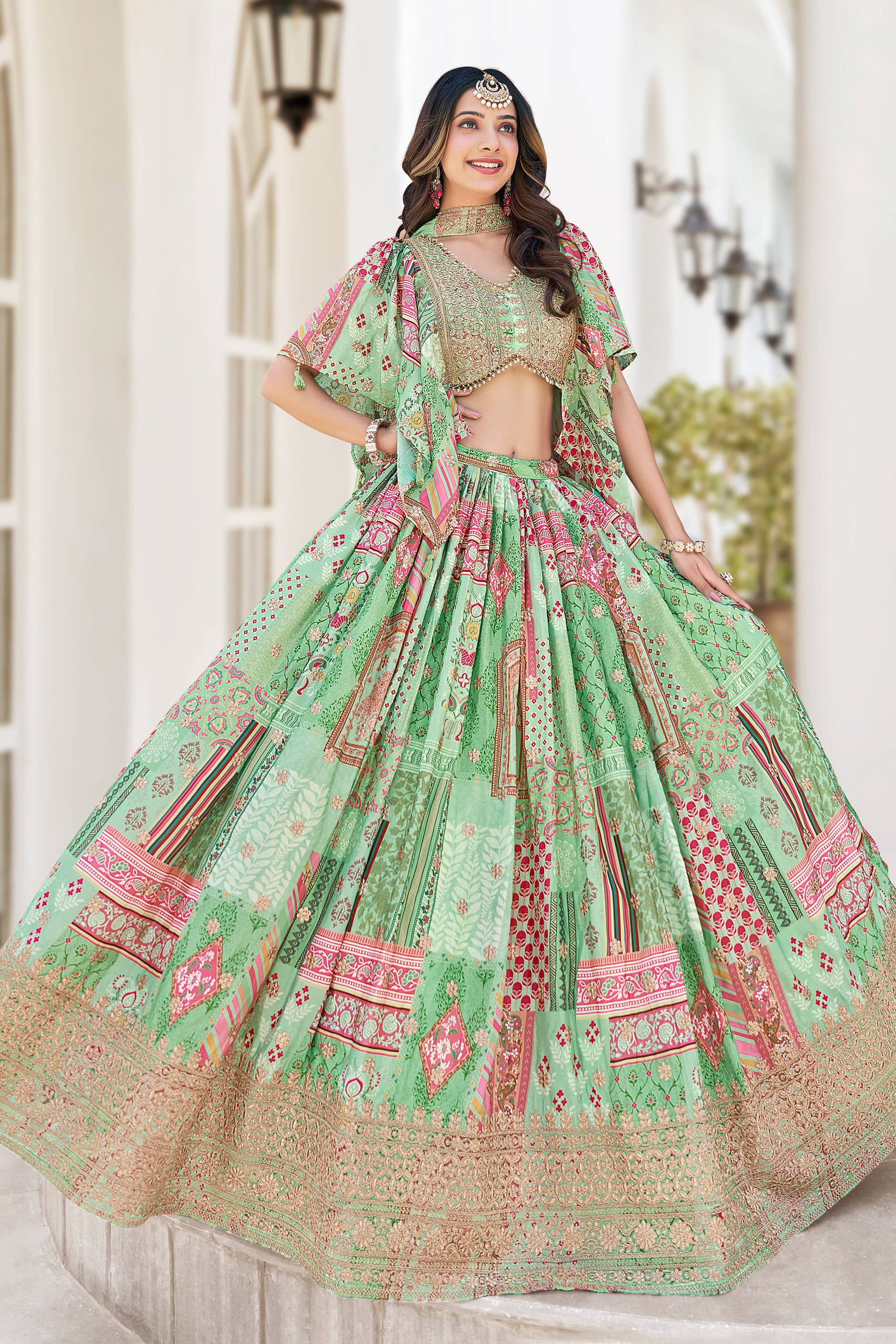 Radiant Green Color Festive Lehenga Choli In Chinon Fabric