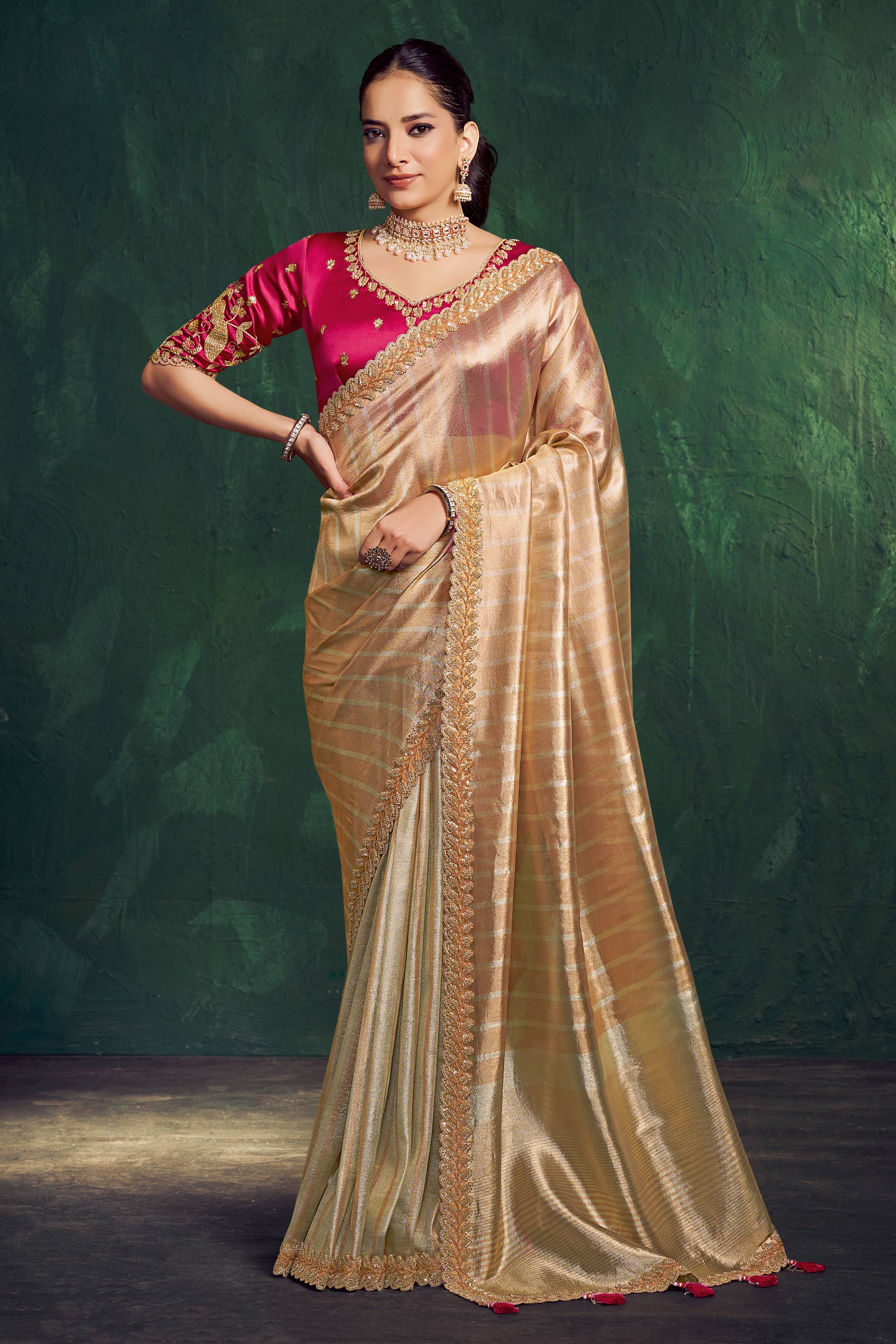 Tissue Embroidered Border Work Beige Saree For Wedding Wear