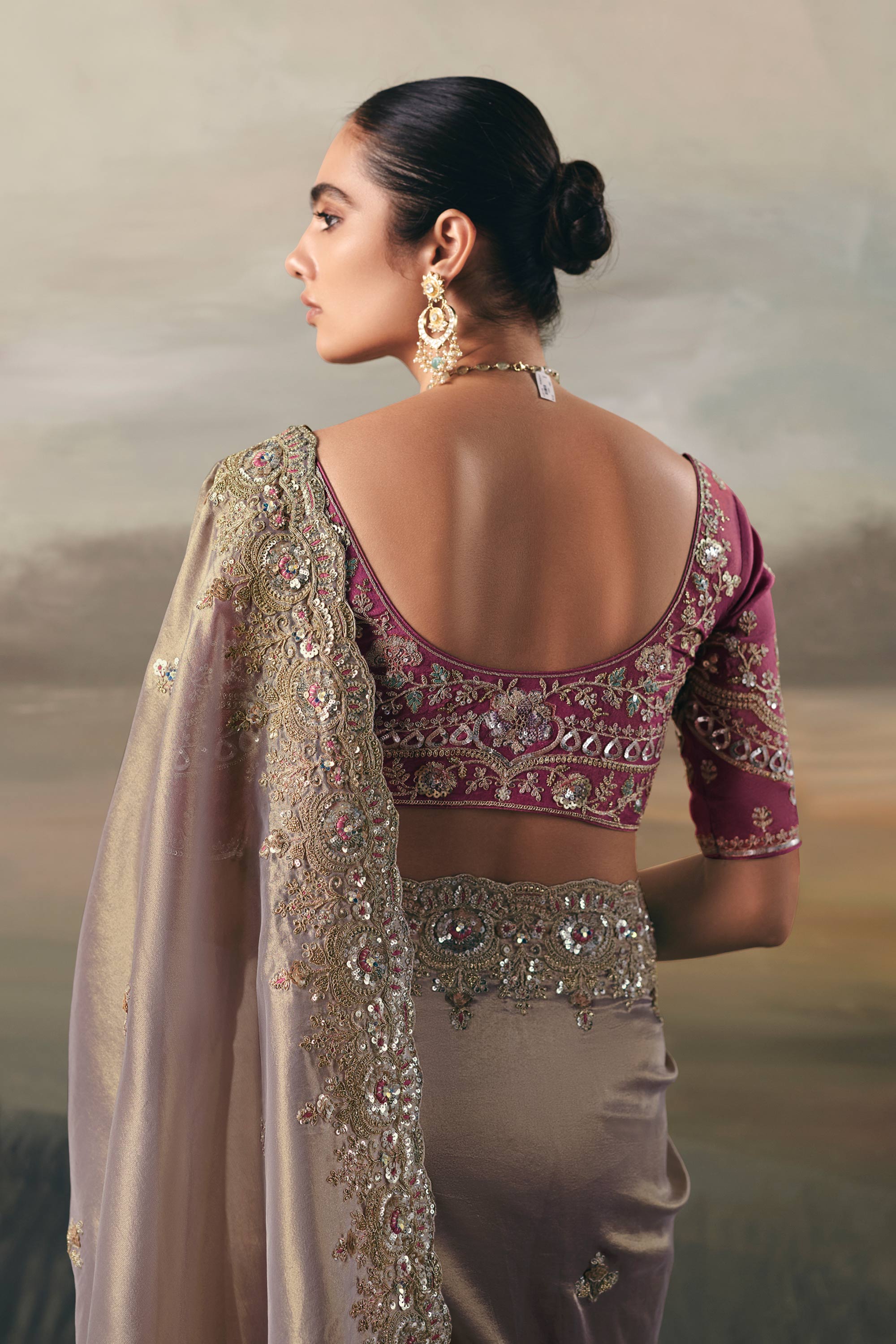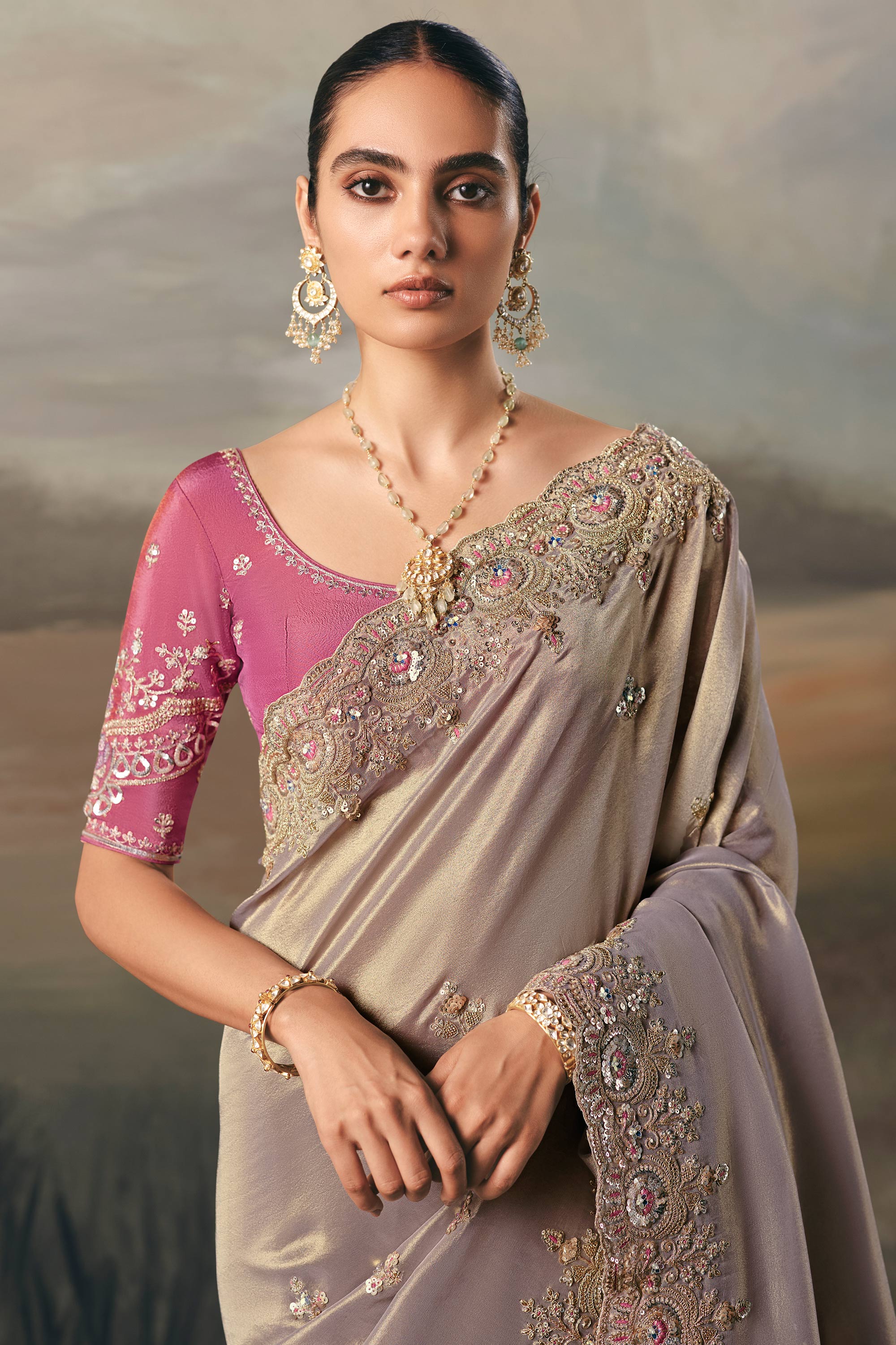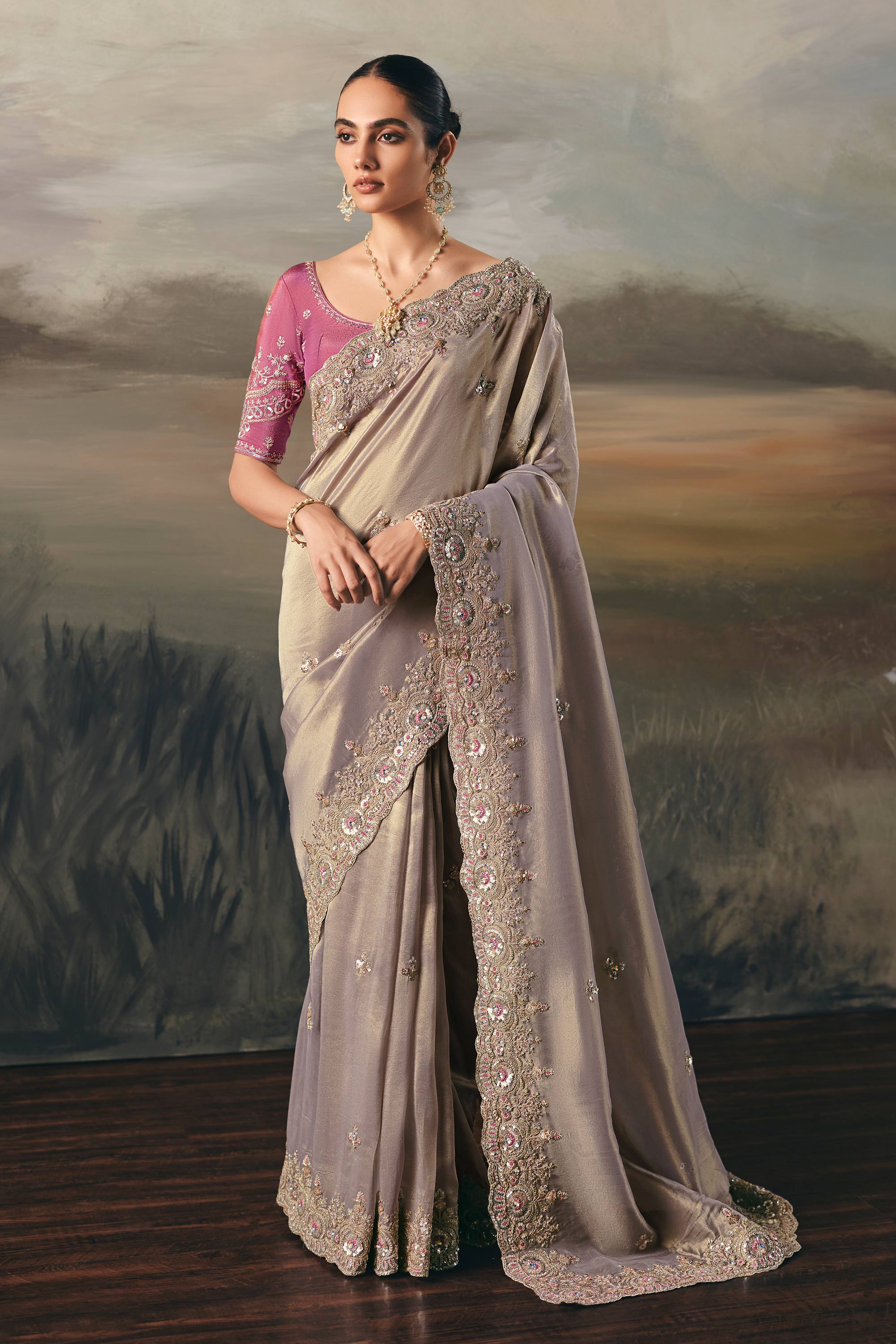 Discover the perfect fusion of style and tradition with this Reach Color Premium Tissue Saree. Featuring a rich zari heavy border, this saree is tailored for Sangeet celebrations and other memorable moments. The premium fabric offers a stunning drape that exudes elegance, while the matching embroidered blouse enhances its charm. This sarees attention to detail and striking design make it a standout piece for weddings, festive events, or family gatherings. Turn heads effortlessly with this must-have addition to your wardrobe.