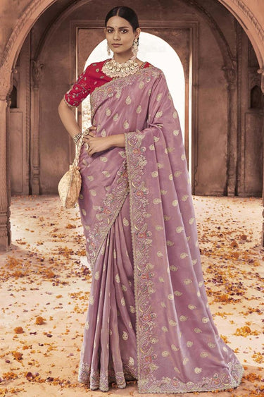Amazing Embroidered Work On Purple Color Tissue Silk Saree