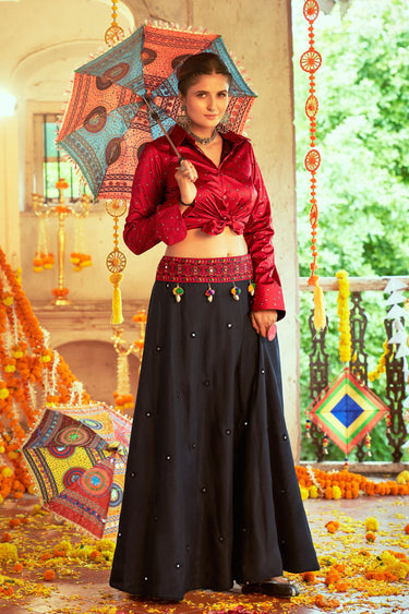 Appealing Cotton Fabric Navratri Special Top Skirt Set In Black Color