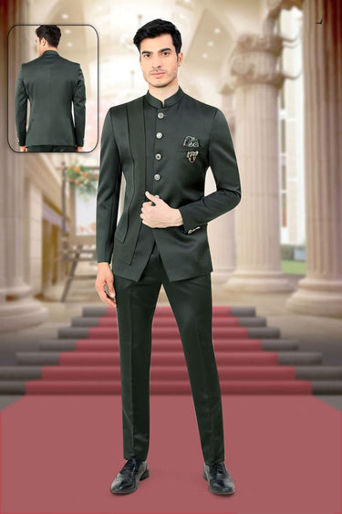 Appealing Dark Green Color Rayon And Satin Fabric Readymade Jodhpuri Suit