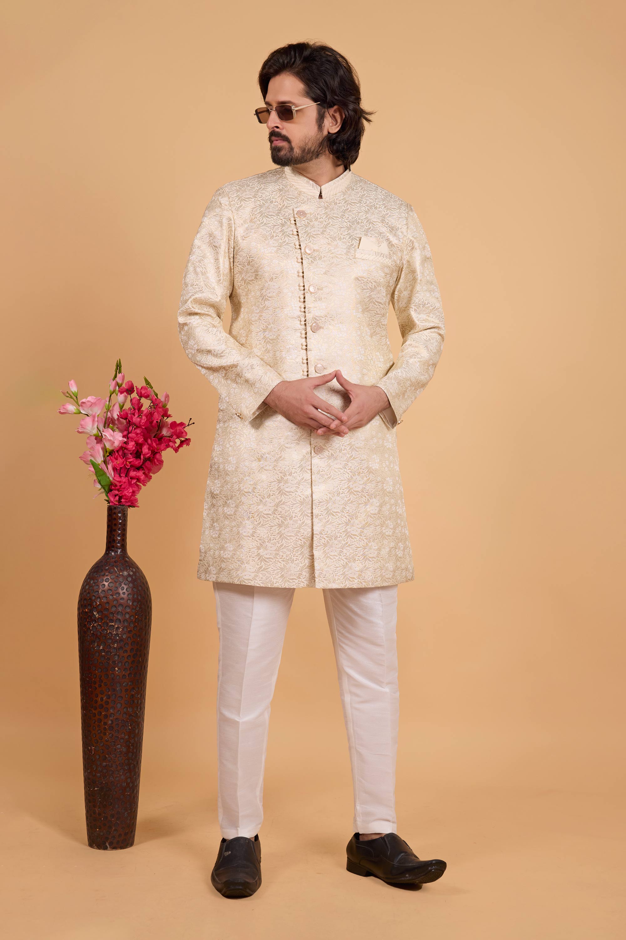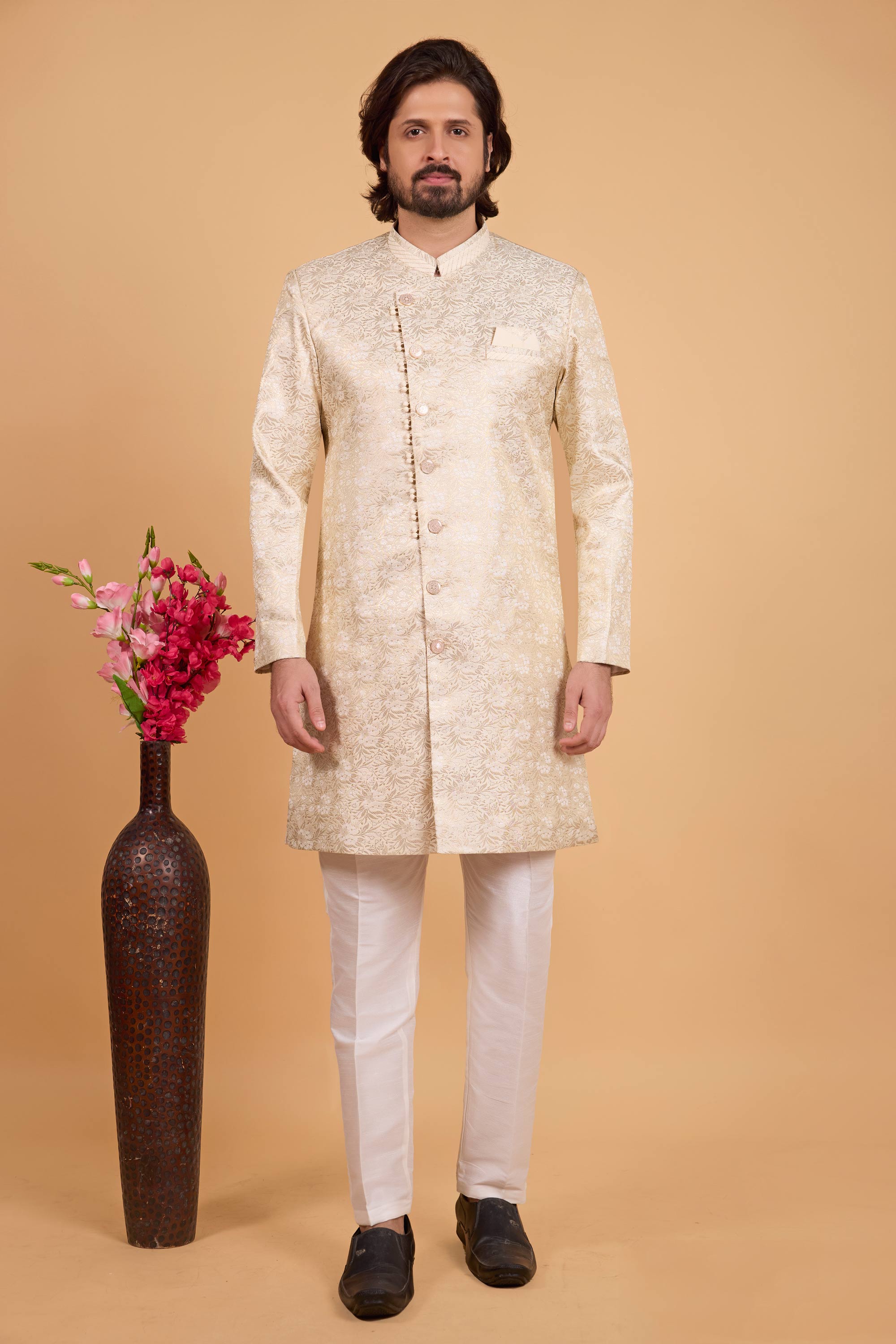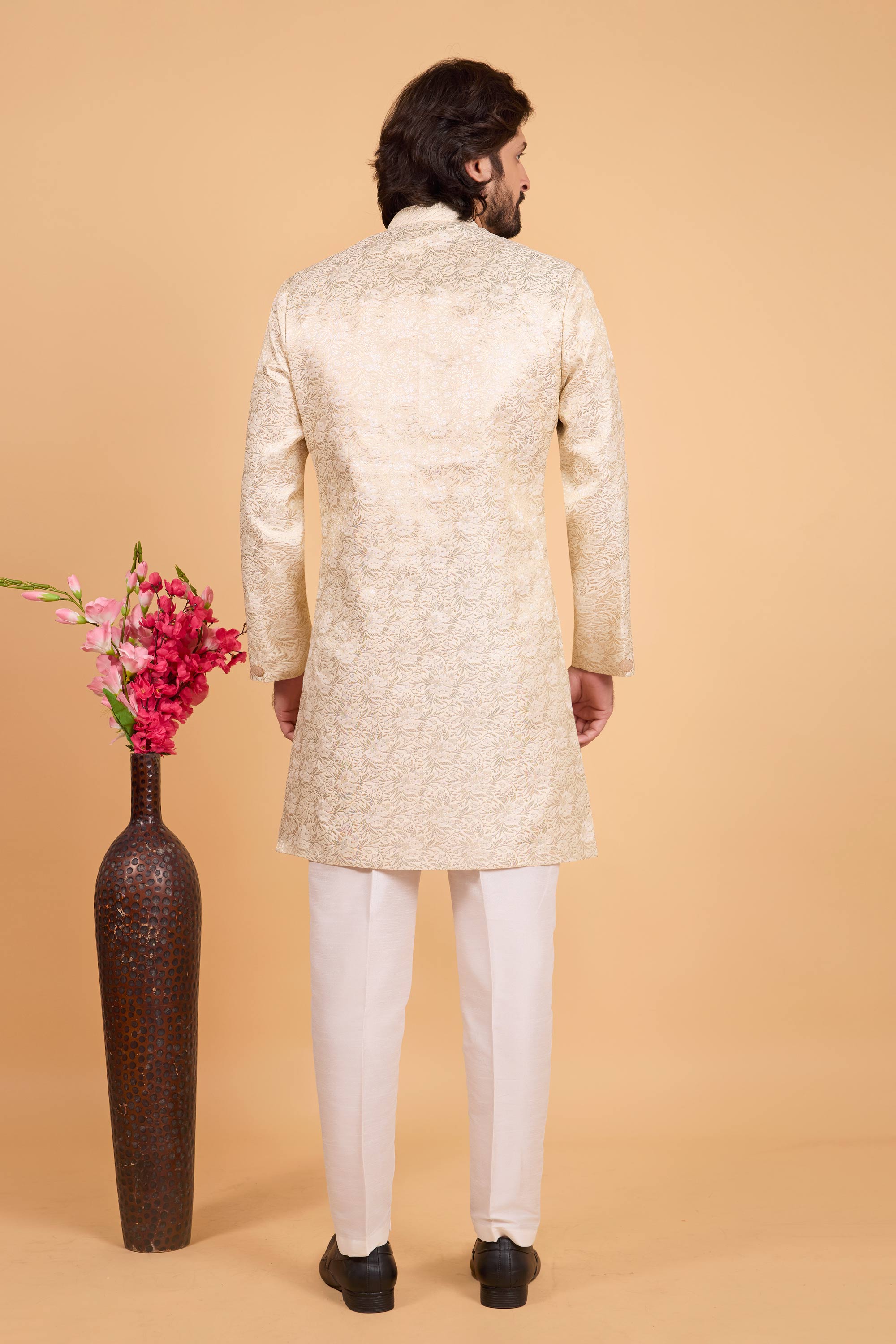 Art Silk Beige Zari Weaving Work Design Readymade Indowestern And Aligadhi Pant For Men