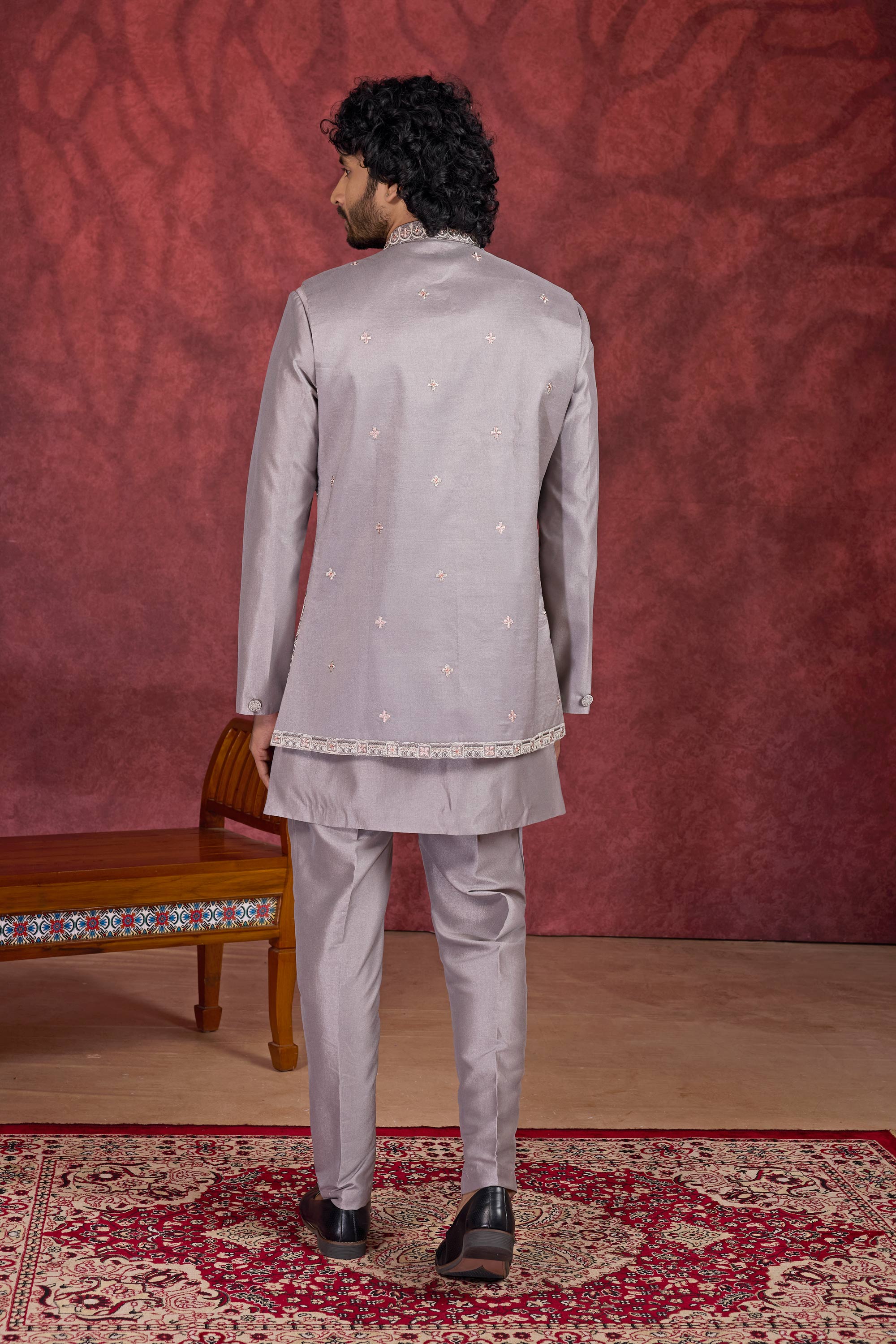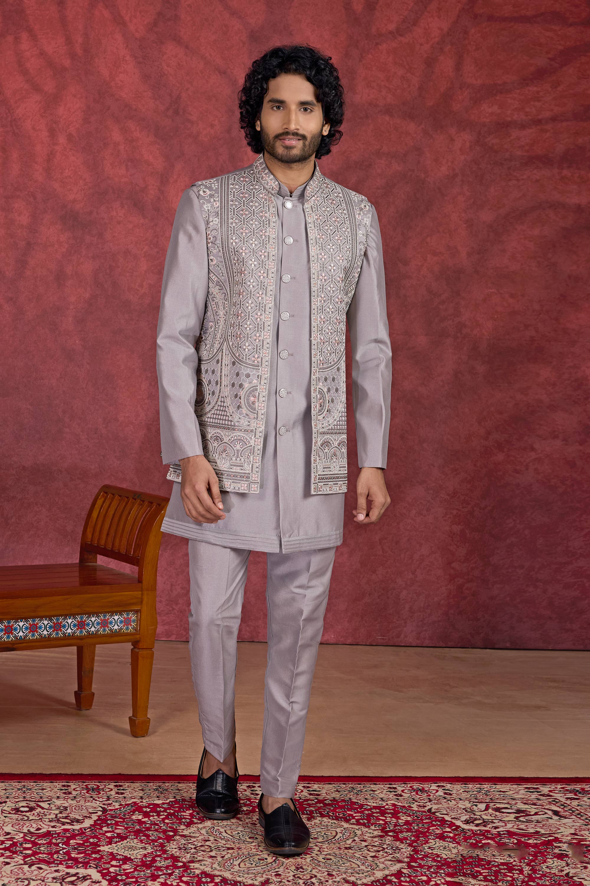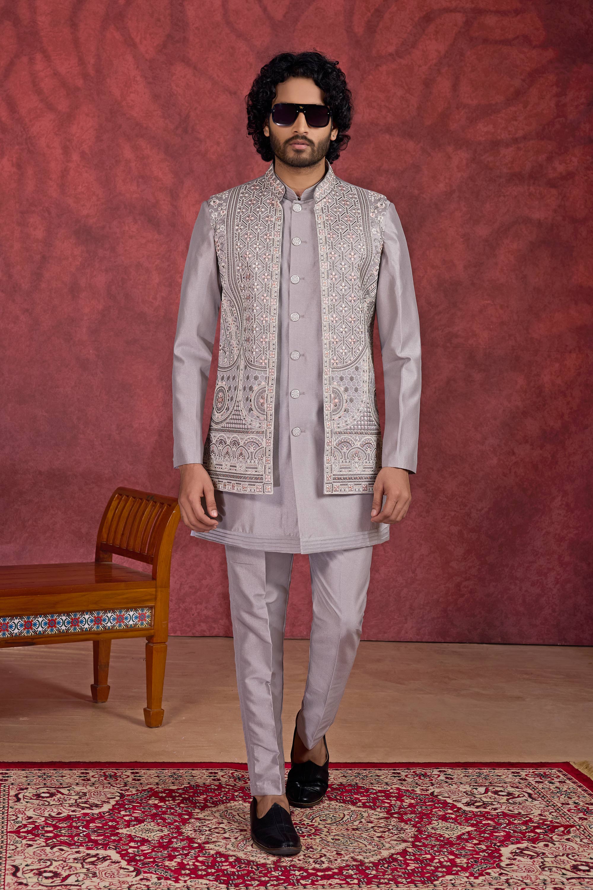 Art Silk Embroidered Grey Function Wear Kurta Pyjama With Jacket For Men
