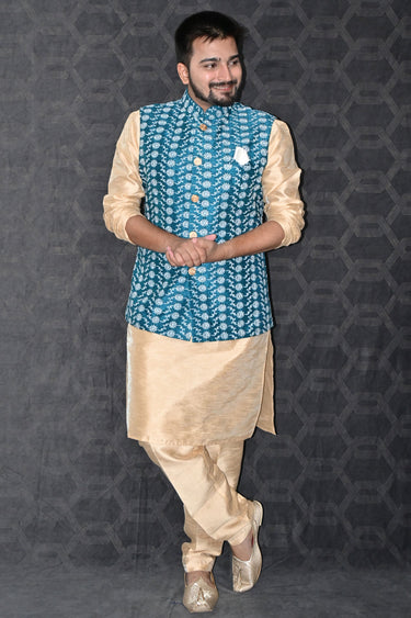 Art Silk Fabric 3 Piece Readymade Kurta With Pyjama And Blue Modi Jacket