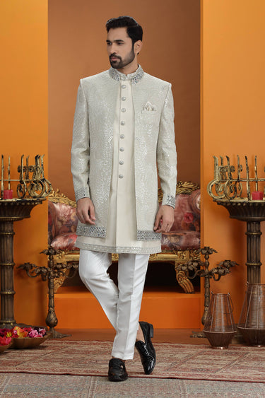 Upgrade your wedding look with this stylish Men Indo Western, designed to deliver a perfect blend of tradition and modern elegance. The top features computer thread embroidery work on premium art silk, giving the outfit a rich and refined appeal. Styled as a 3-piece jacket set, it adds a royal touch suitable for special occasions. Due to digital photography, slight color variations may occur.