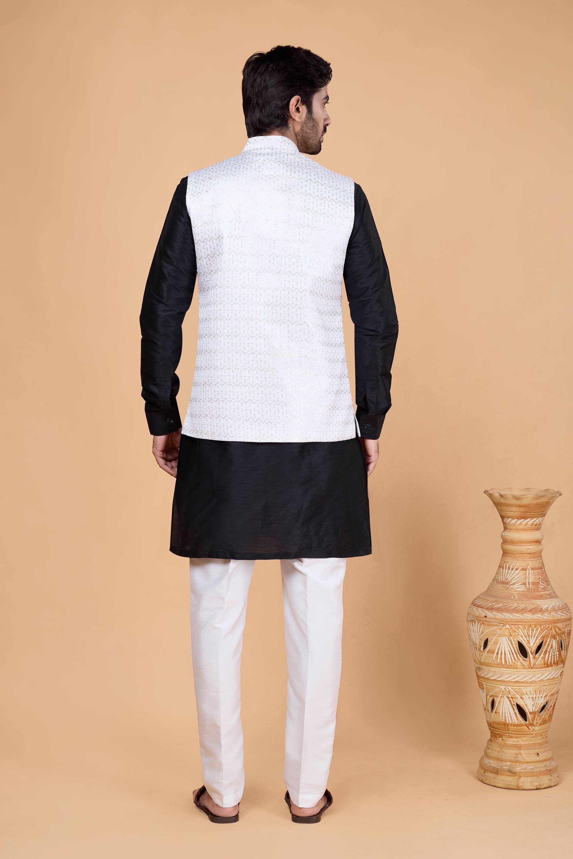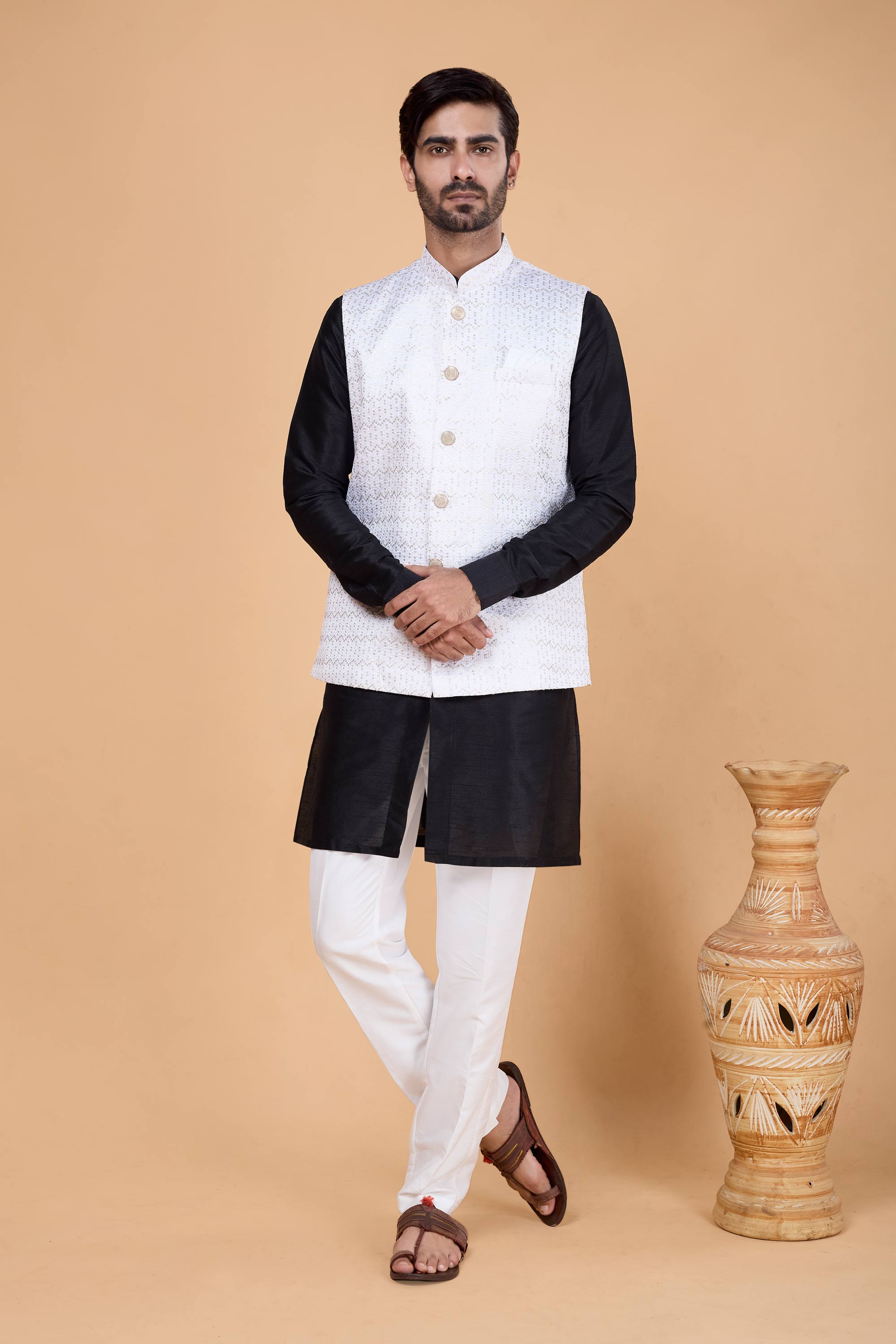 Complete your festive wardrobe with this elegant 3-piece ensemble featuring a ready-to-wear kurta, stylish jacket, and comfortable Aligadhi pants. Crafted from high-quality fabric, this outfit blends traditional style with modern tailoring for a sleek, contemporary fit. Ideal for weddings, family gatherings, or cultural celebrations, its vibrant color adds a touch of charm and sophistication. The pre-stitched design ensures ease and convenience, so you’re ready to shine effortlessly. Elevate your traditional look with this must-have addition to your ethnic collection.