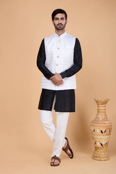 Art Silk Fabric Black Men Readymade Kurta And Aligadhi Pant With Embroidered Jacket