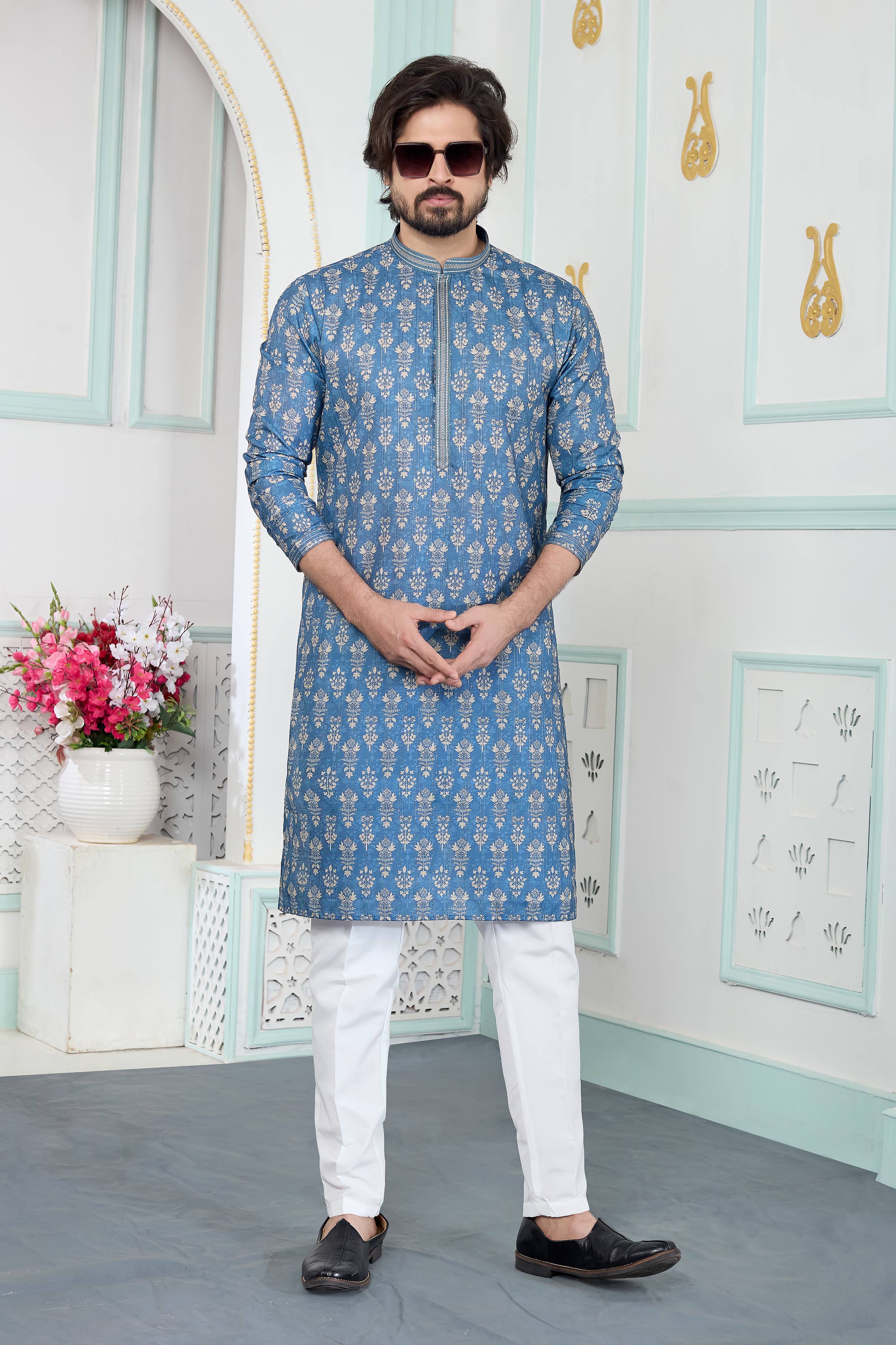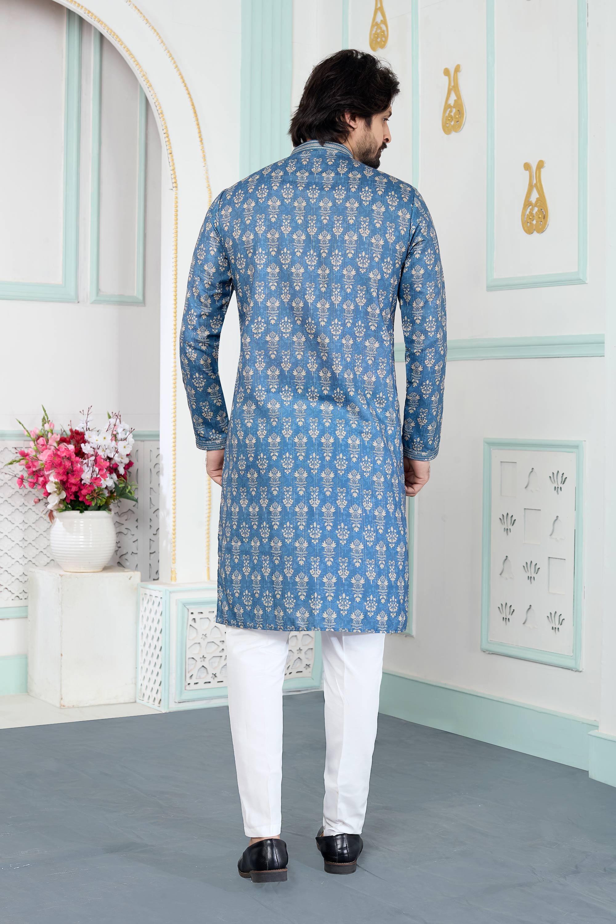 Art Silk Fabric Blue Festive Wear Readymade Kurta Pyjama For Men