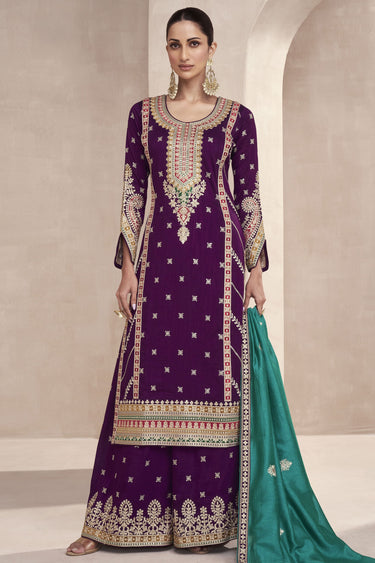 Art Silk Fabric Embroidered Designer Readymade Palazzo Salwar Kameez In Purple Color