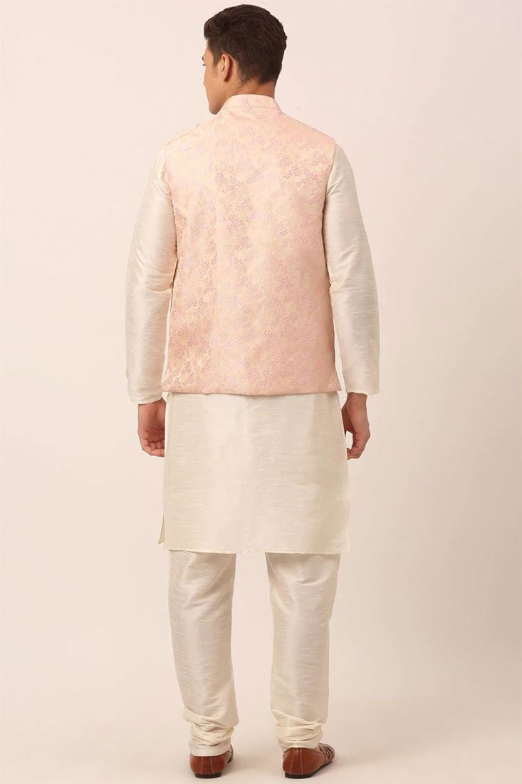 Art Silk Fabric Festival Wear White Color Kurta Pyjama With Pink Jacket