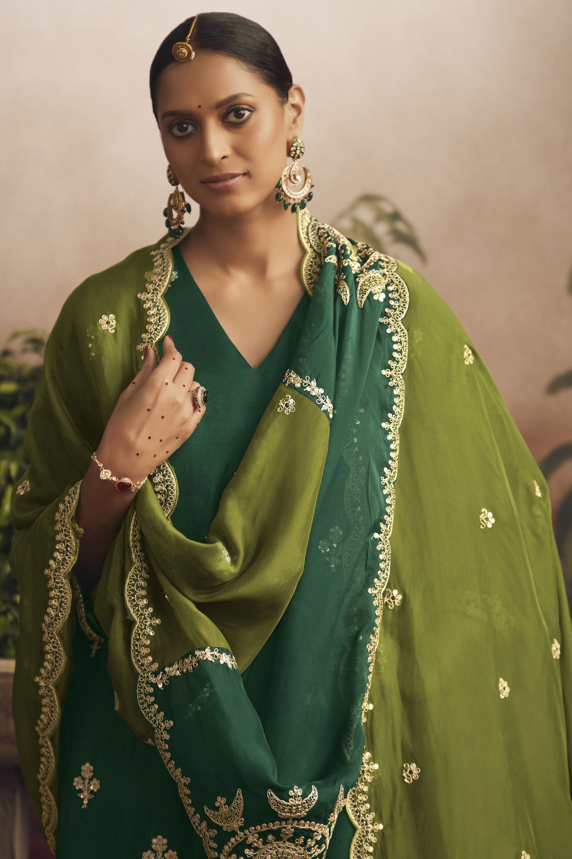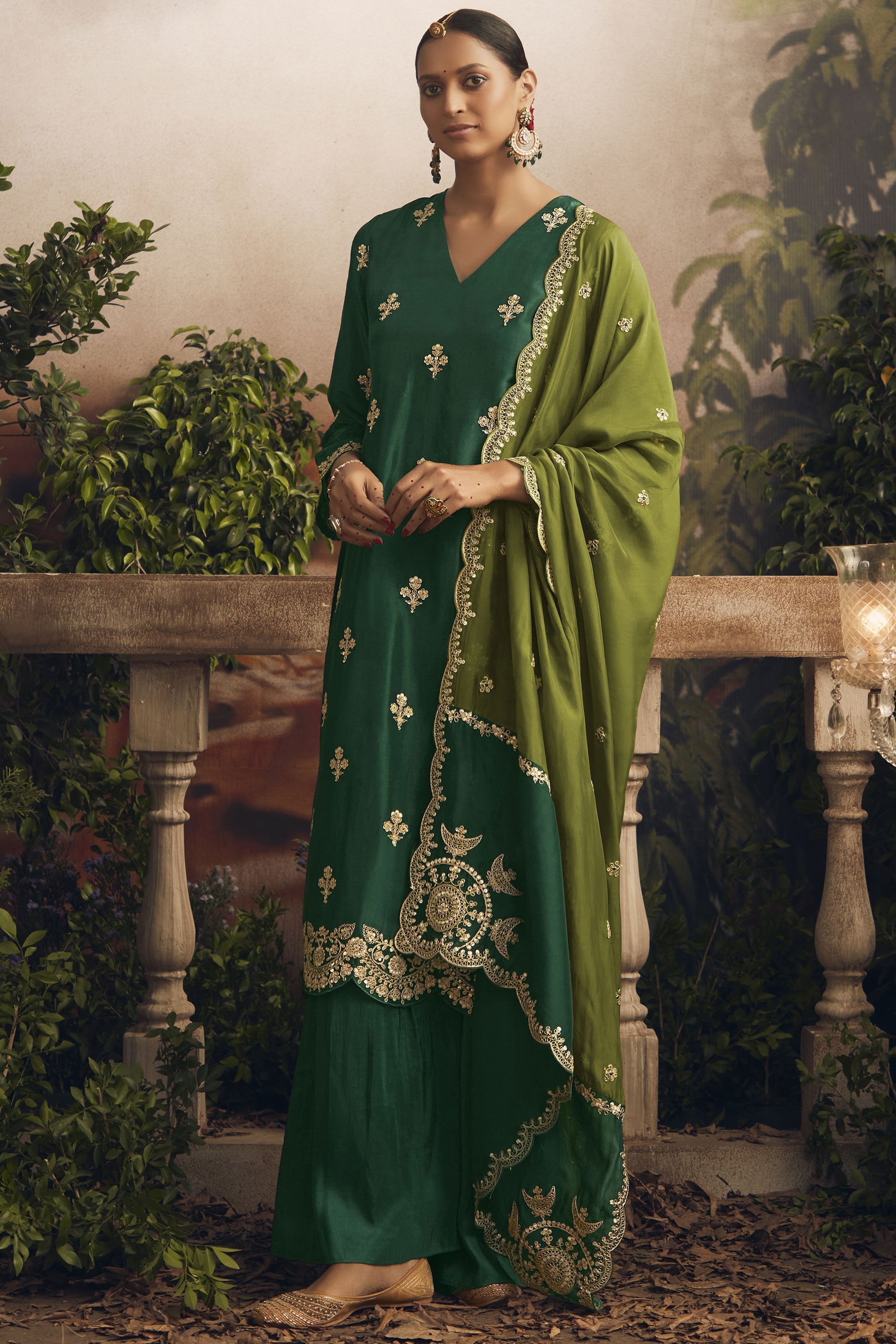 Embrace your inner elegance with our Festive Wear Salwar Suit crafted from sumptuous art silk. It comes under our unique Designer Salwar Kameez category, which will uplift your traditional wardrobe. The top is fashioned with delicate embroidery buttis and a scalloped border on the hemline and sleeves. It pairs perfectly with the silk modale bottom. Our Salwar Suit set comes with a pure organza dupatta that has stunning embroidered panels stitched together and four-sided scalloped embroidery for a rich look. This semi-stitched outfit has a top length of 46 inches and a size of 54 inches. Don't miss this item from our exclusive Bridal Collection!