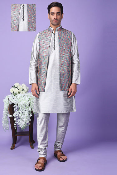 Art Silk Fabric Grey Color Festive Wear Readymade Stunning Kurta Pyjama For Men With 3 Pcs Embroidered Jacket Set