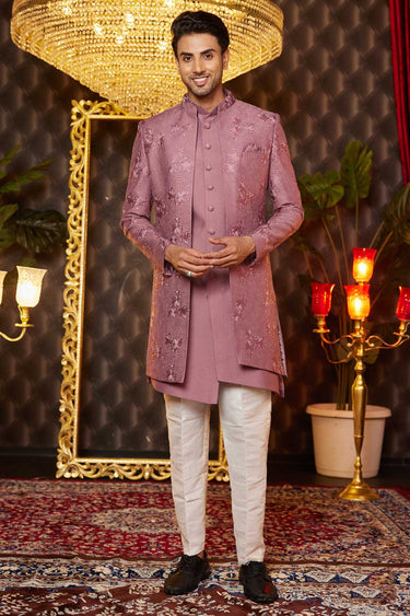 Art Silk Fabric Heavy Embroidered Pink Color 3 Piece Indo Western For Men