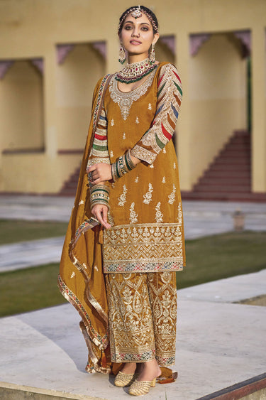 Art Silk Fabric Mustard Color Stylish Look Readymade Embroidered Salwar Suit