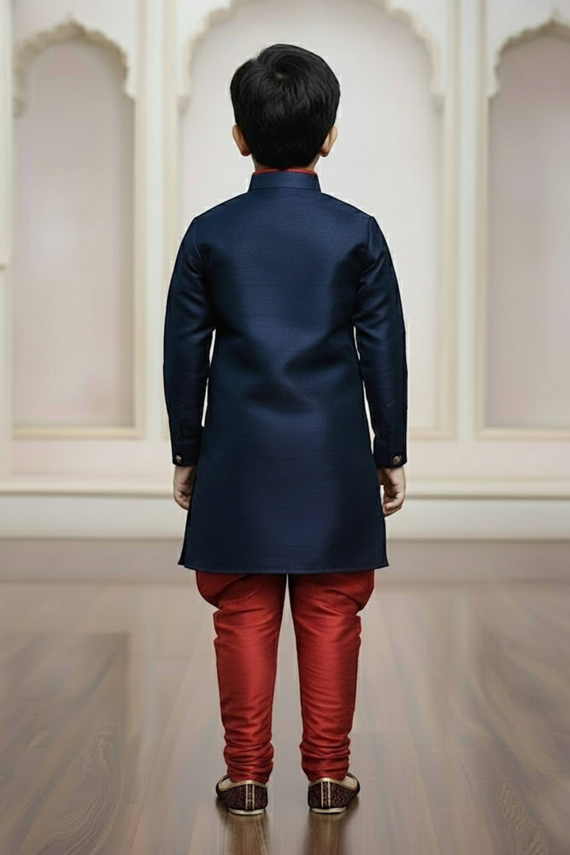 Make your child shine with this stunning Art Silk Indo Western outfit, specially designed for weddings and traditional occasions. Tailored from premium art silk fabric, this readymade attire combines comfort and style, ensuring a perfect fit for young boys. The unique reach color adds a modern yet classy touch to this ethnic wear, making it a top choice for special moments. Lightweight and breathable, this outfit allows freedom of movement without compromising elegance. Pair it with mojaris or traditional footwear for an authentic look. Ideal for celebrations or cultural gatherings, it promises a dapper and graceful appearance.