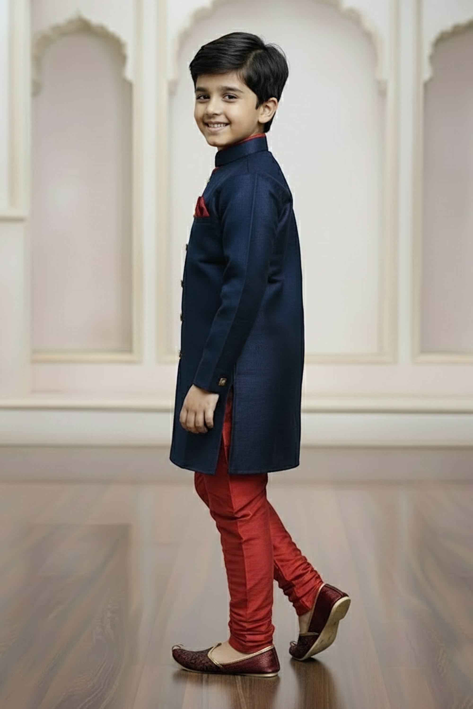 Art Silk Fabric Navy Blue Readymade Indo Western For Boys