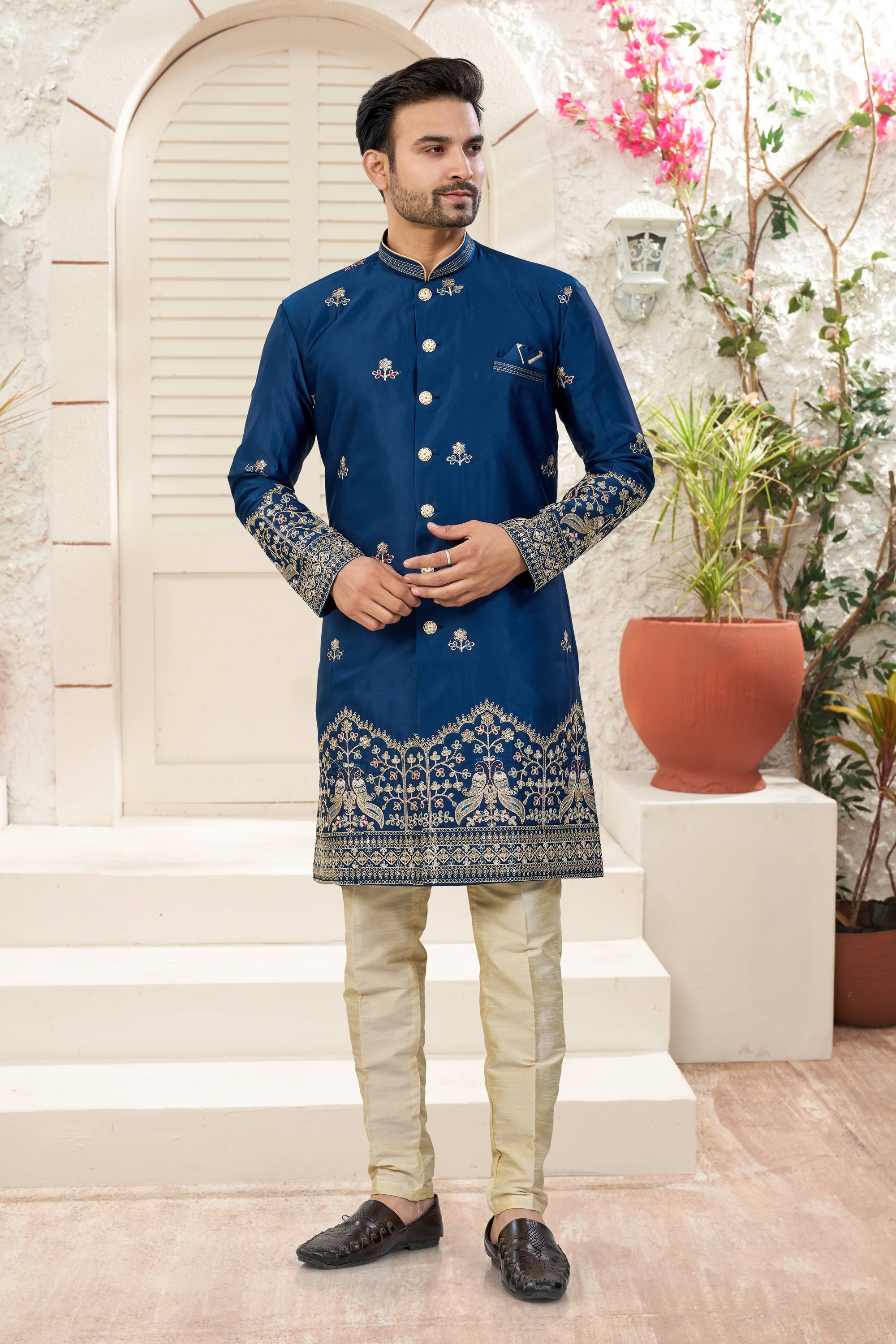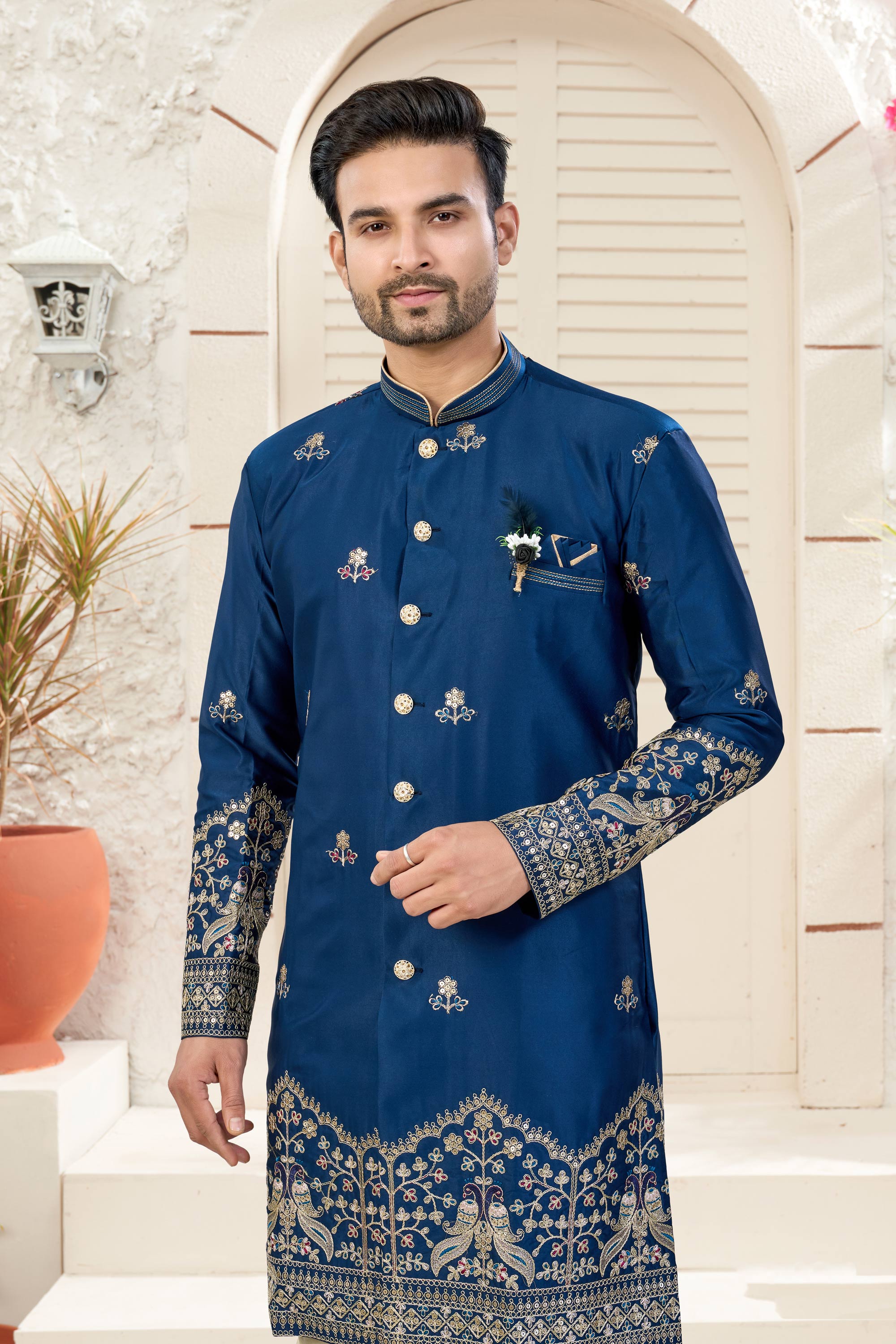 Art Silk Fabric Navy Blue Wedding Wear Readymade Indo Western For Men