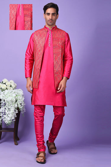 Art Silk Fabric Rani Color Ethnic Readymade Men Kurta Pyjama With Embroidered Jacket