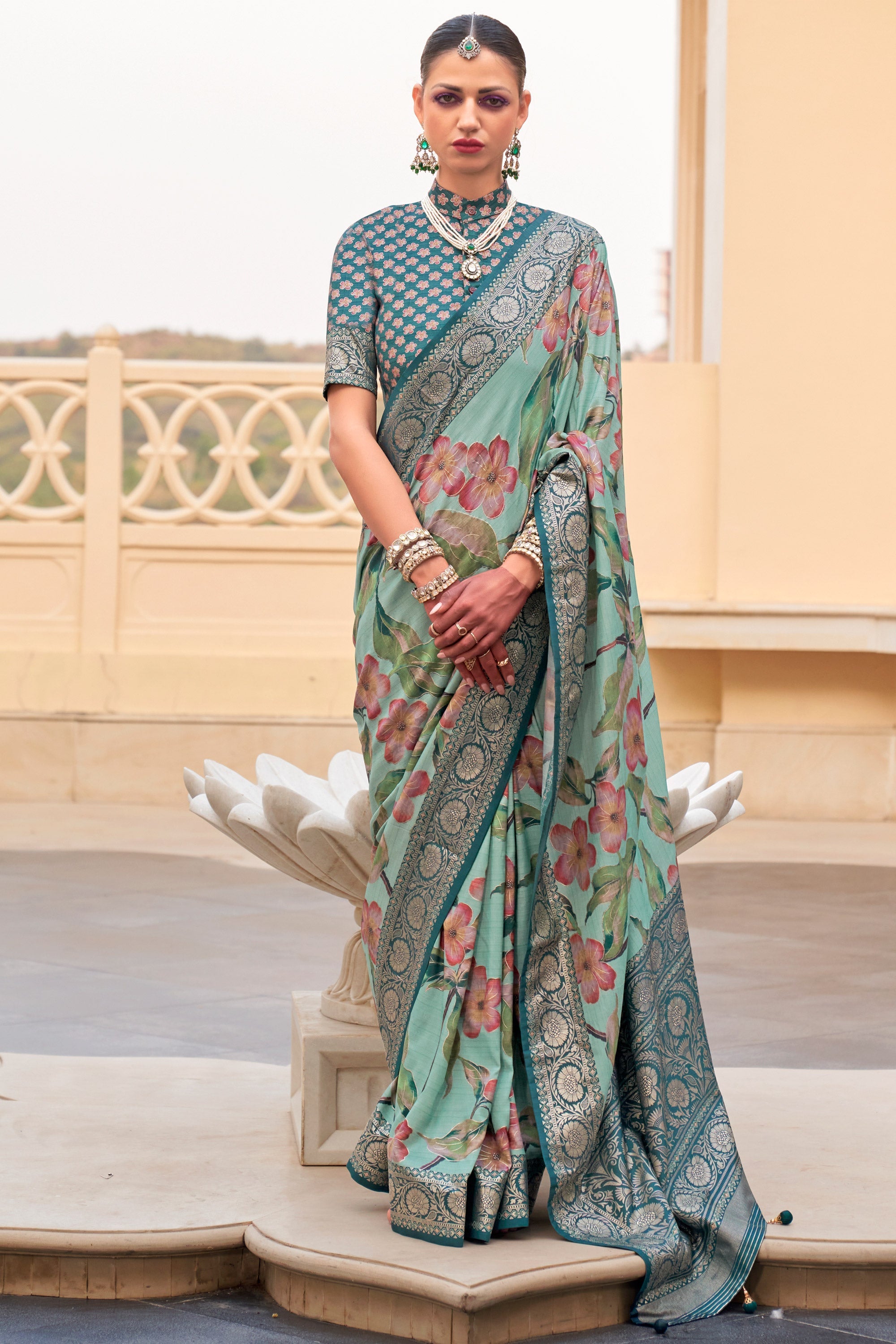 Art Silk Fabric Sea Green Color Beautiful Saree With Printed Blouse