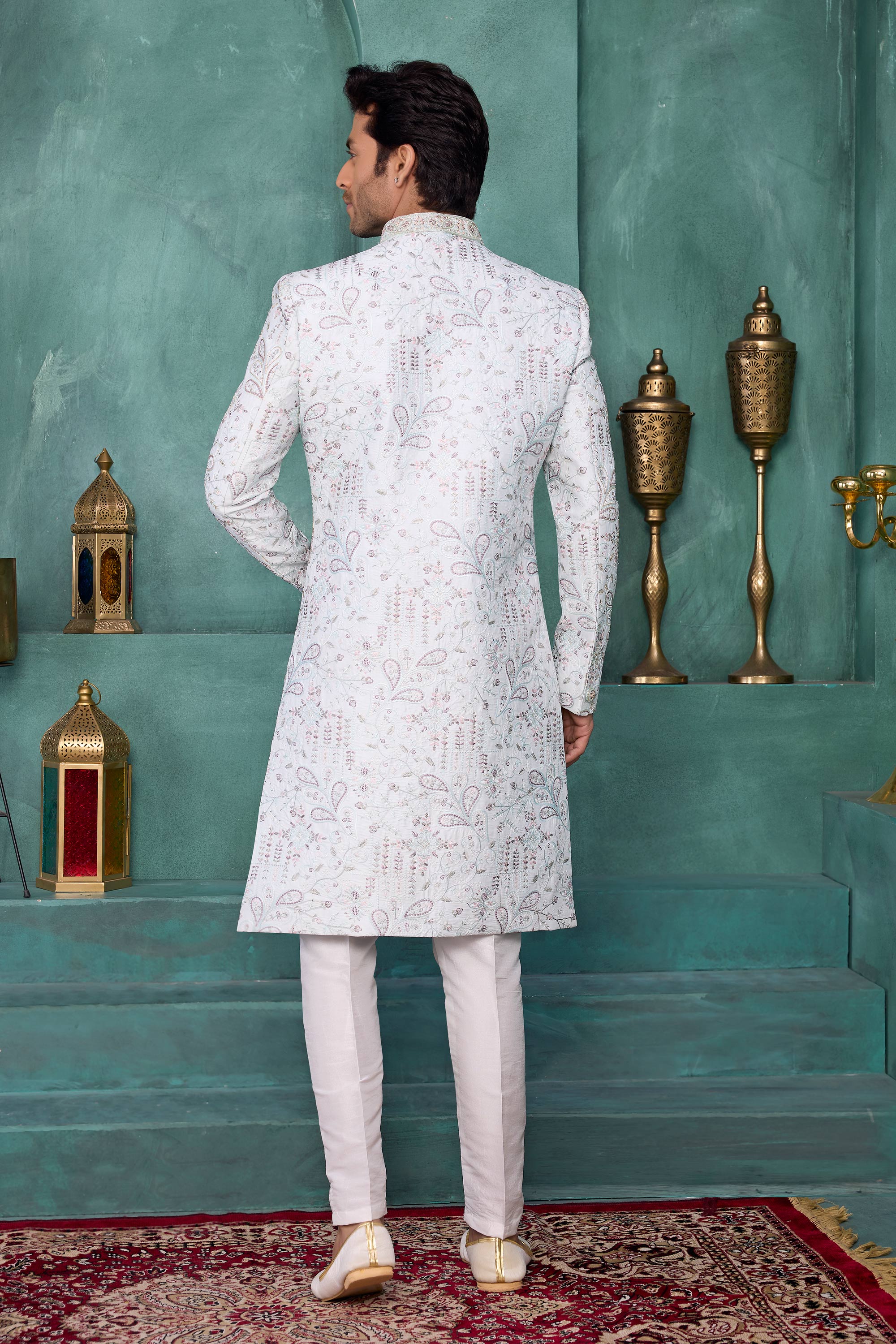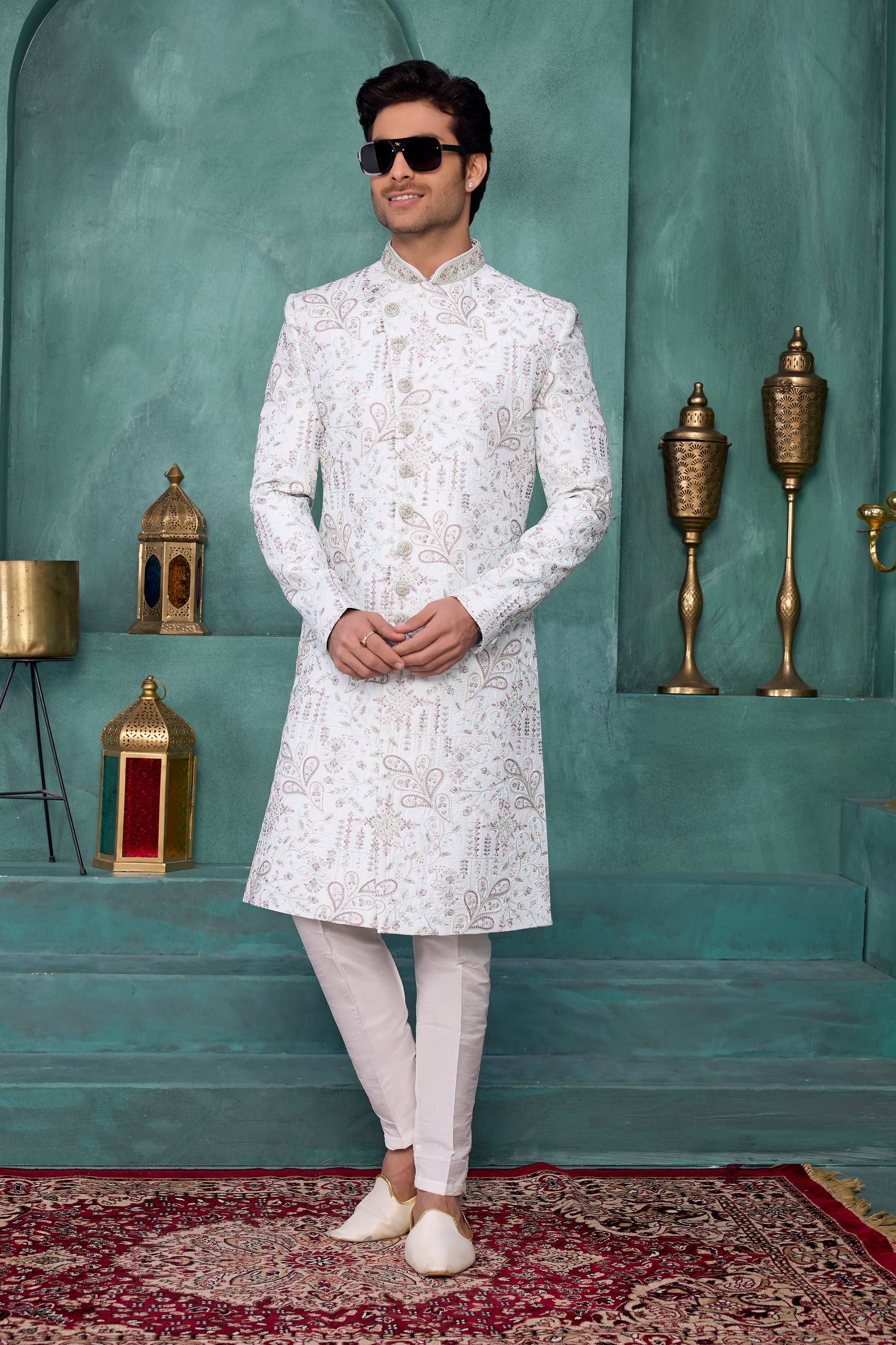 Art Silk Fabric White Wedding Wear Readymade Sherwani For Men