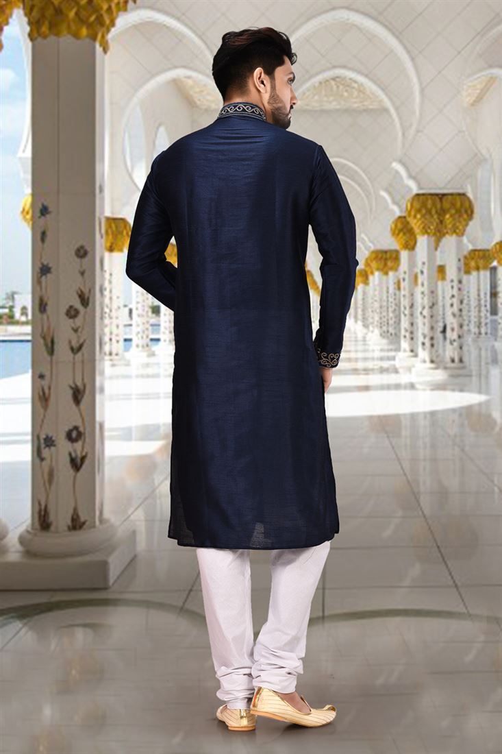 Art Silk Navy Blue Color Wedding Wear Readymade Designer Men Kurta Pyjama