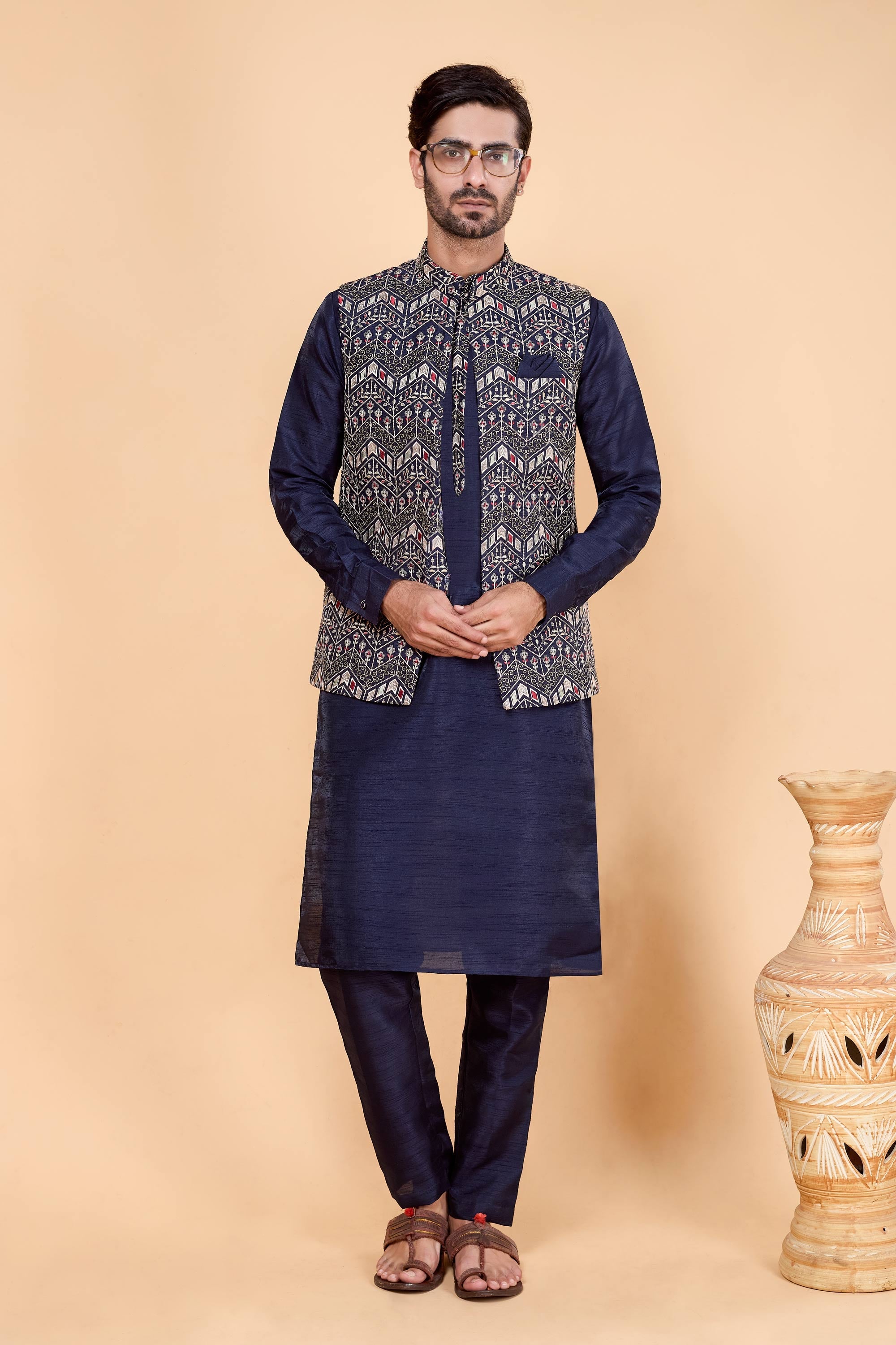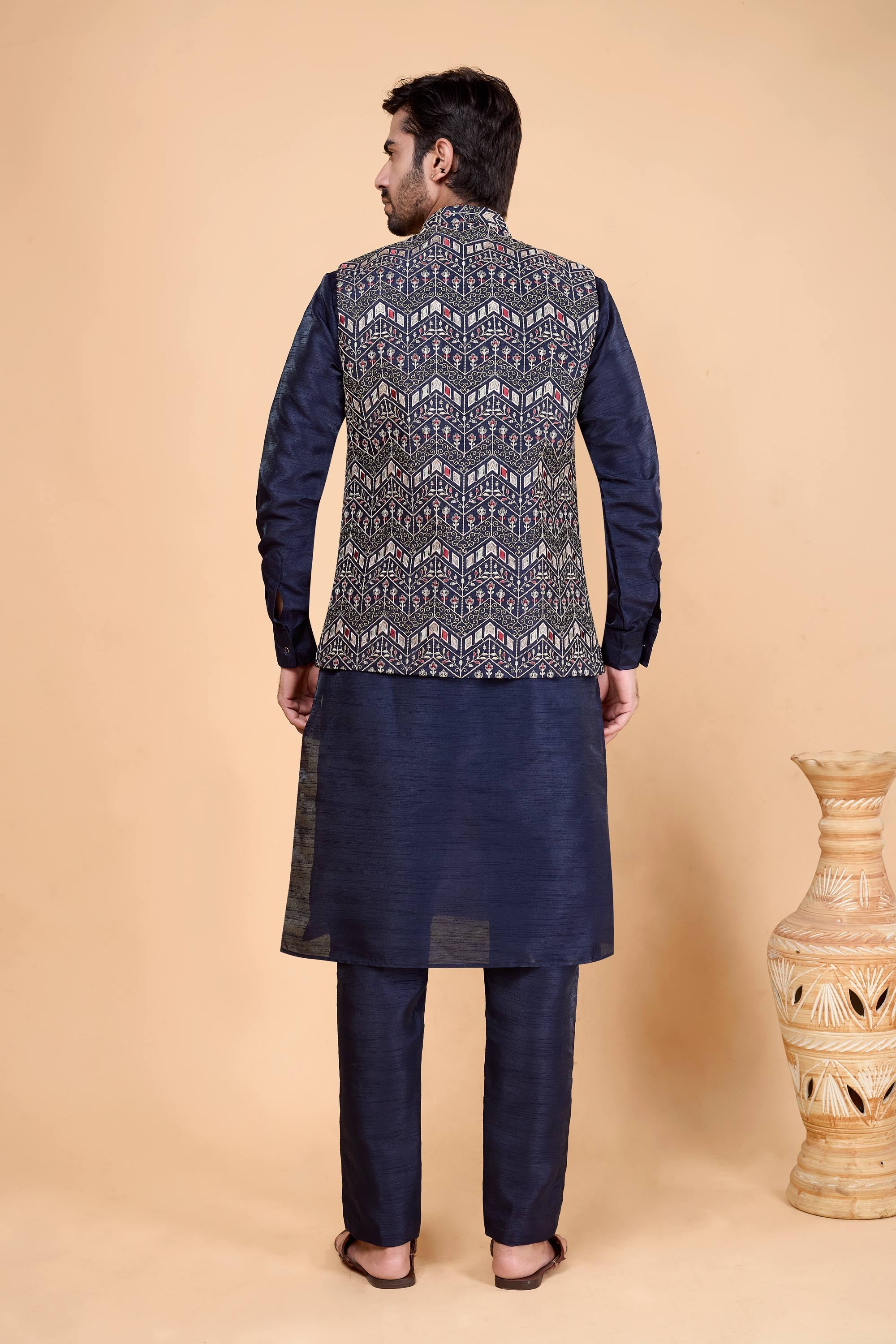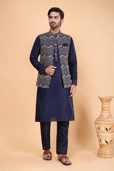 Art Silk Navy Blue Men Readymade Kurta And Aligadhi Pant With Embroidered Jacket