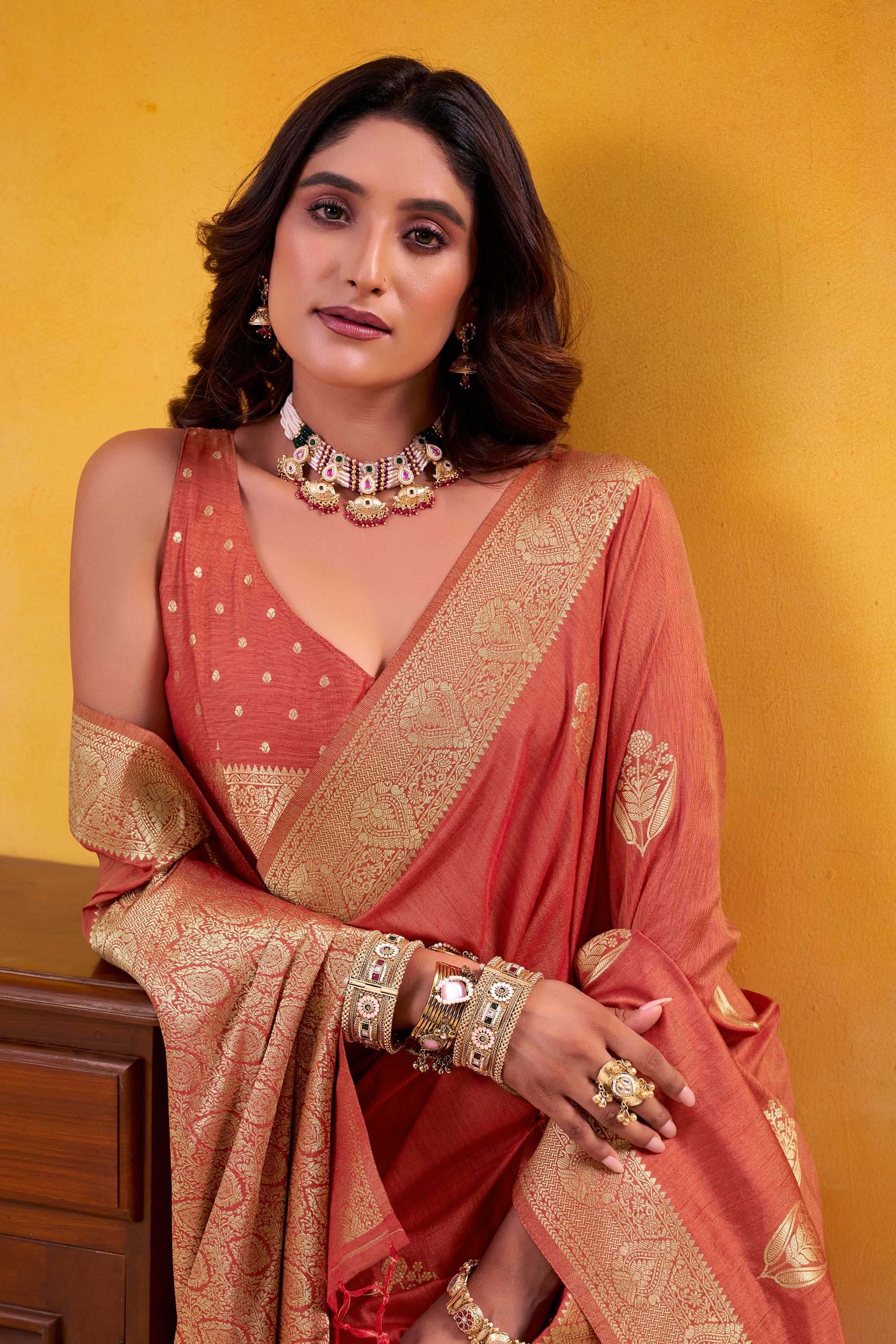 Art Silk Peach Weaving Work Saree For Function Wear