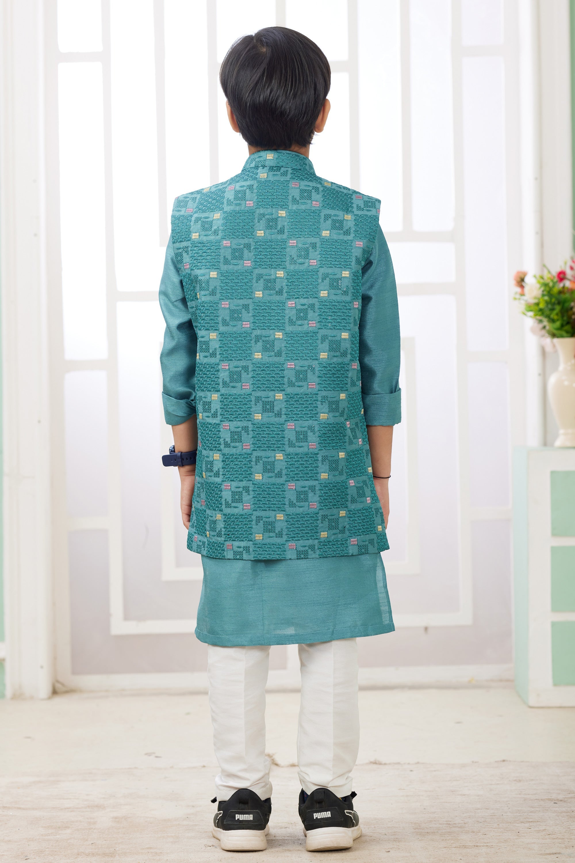 Art Silk Teal Boys Readymade Kurta Pyjama With Designer Jacket