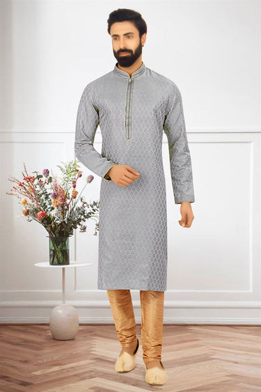 Artistic Grey Color Readymade Men Kurta Pyjama For Wedding Wear